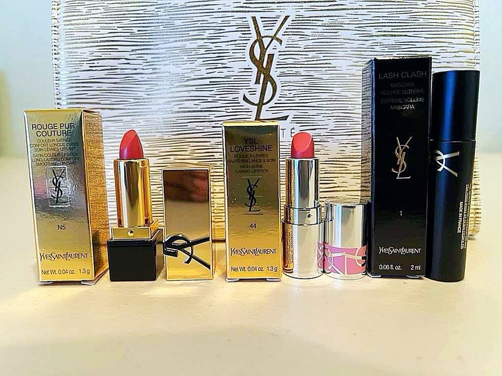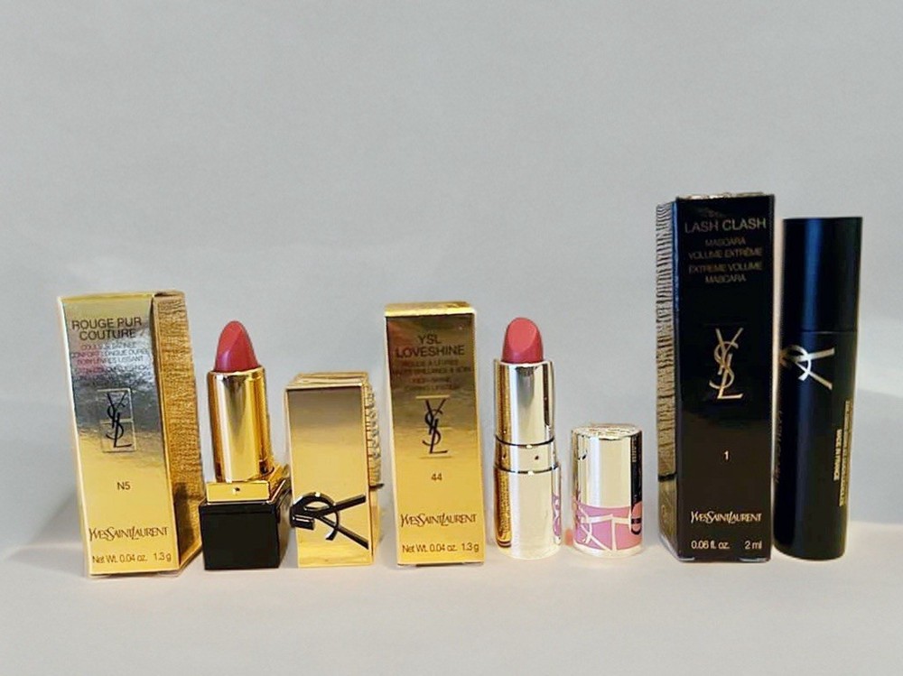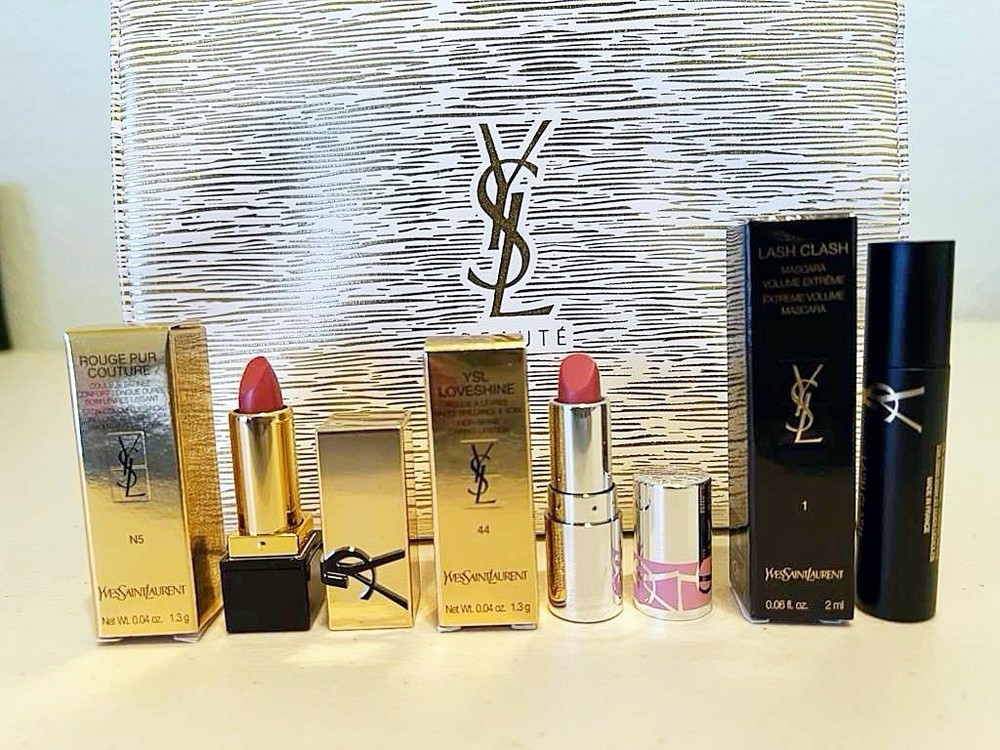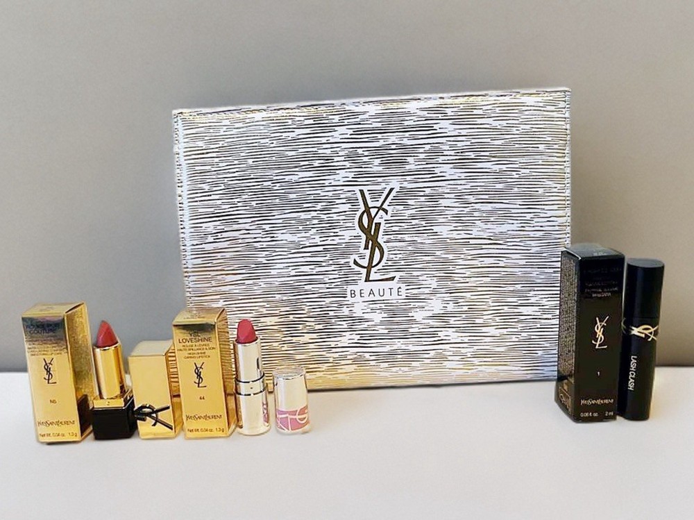 • YSL Beauté Cosmetic Bag • YSL Touche Éclat Blur Primer • YSL Rouge Pur Couture Lipstick • YSL Loveshine Candy Glow Lip Balm • YSL Lash Clash Extreme Volume Mascara