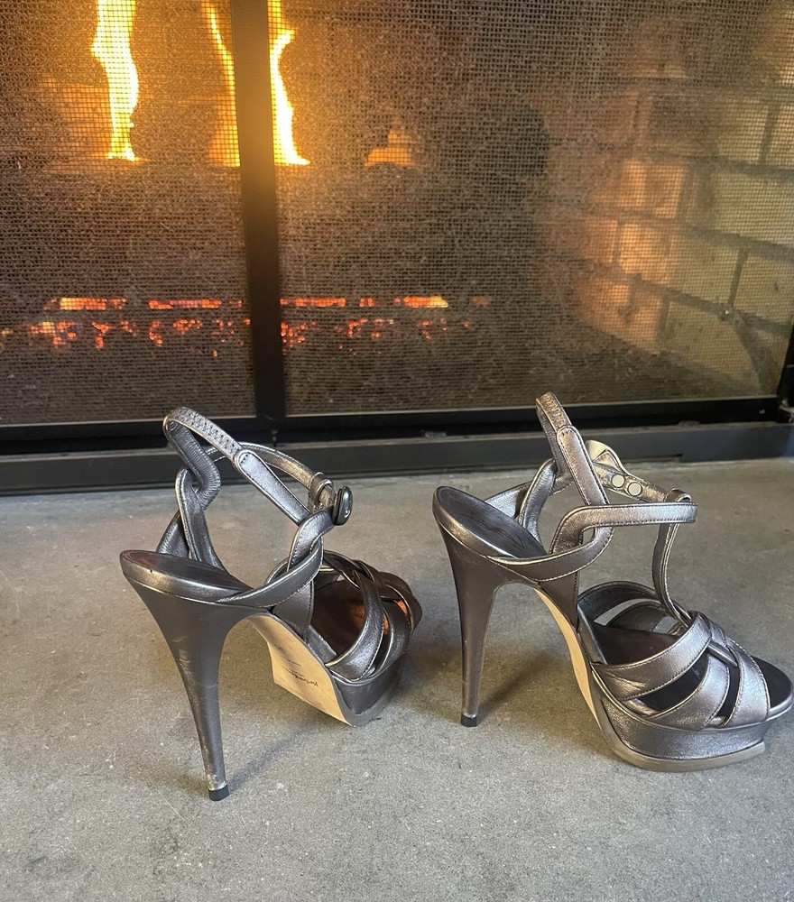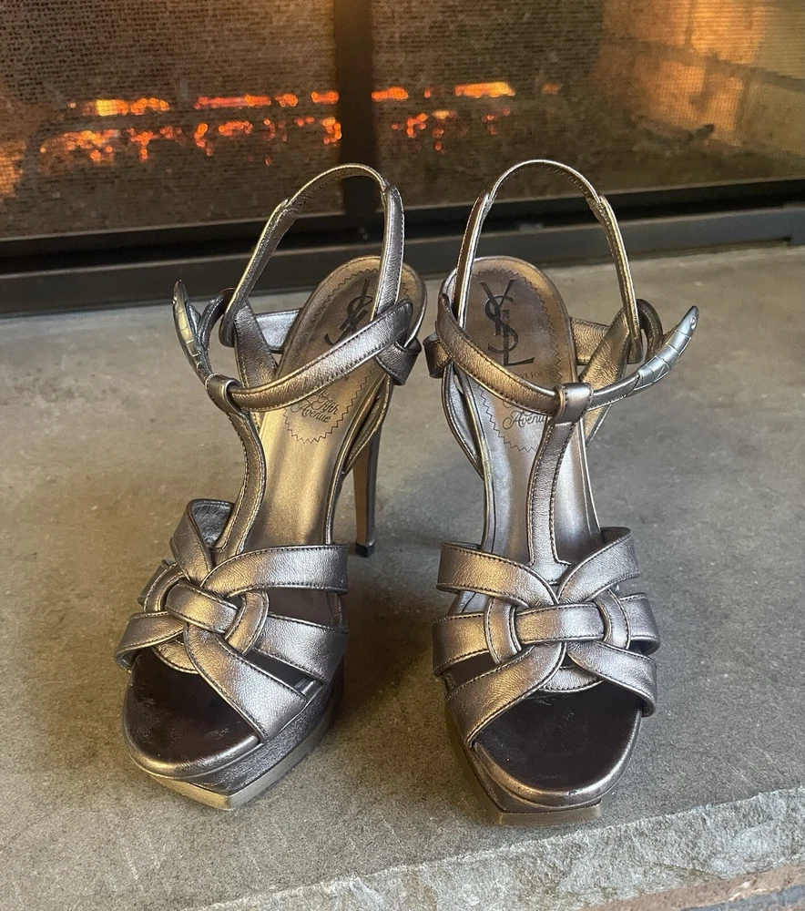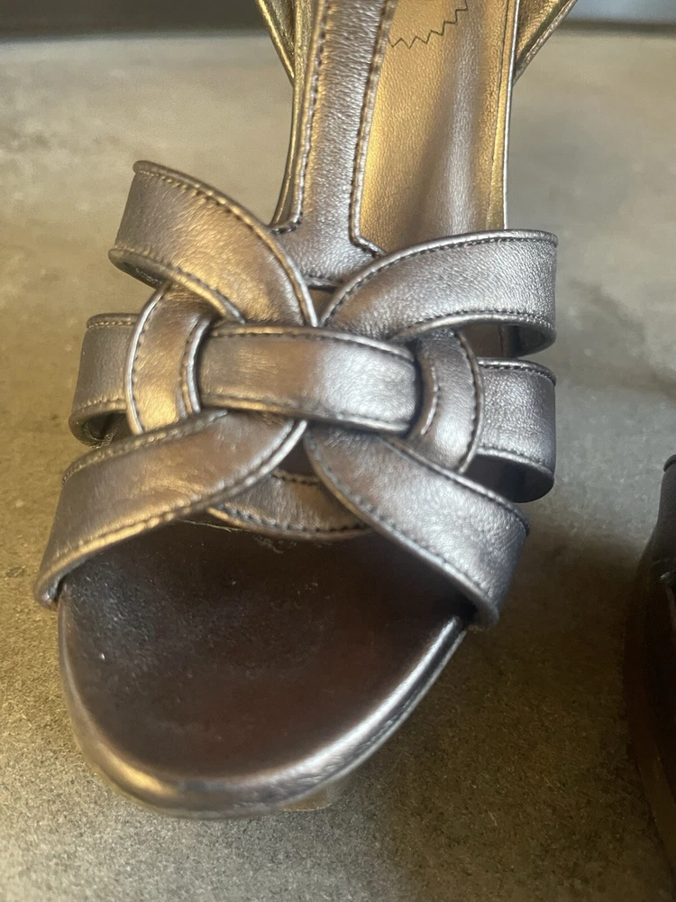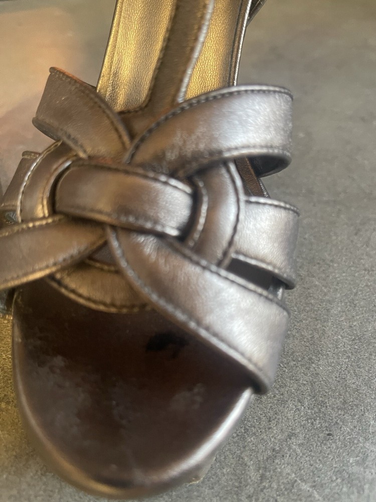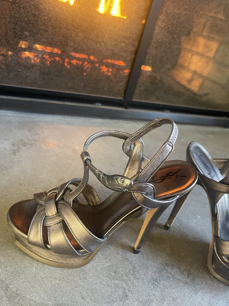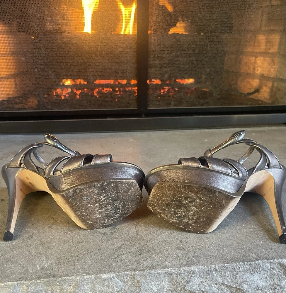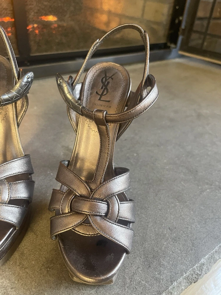 YSL Platform Sandals Excellent condition, minor signs of wear. Heels just redone Gorgeous sandals- classic. Metallic color leather. Snake buckle strap 5.25 inch heel 1.25 inch platform