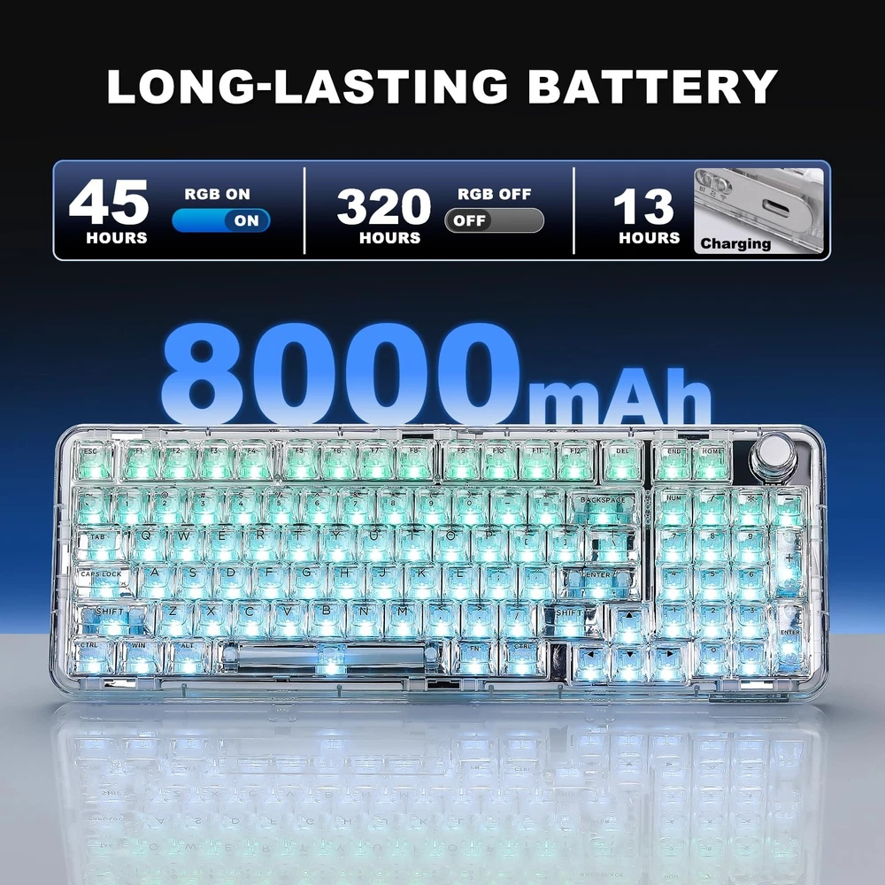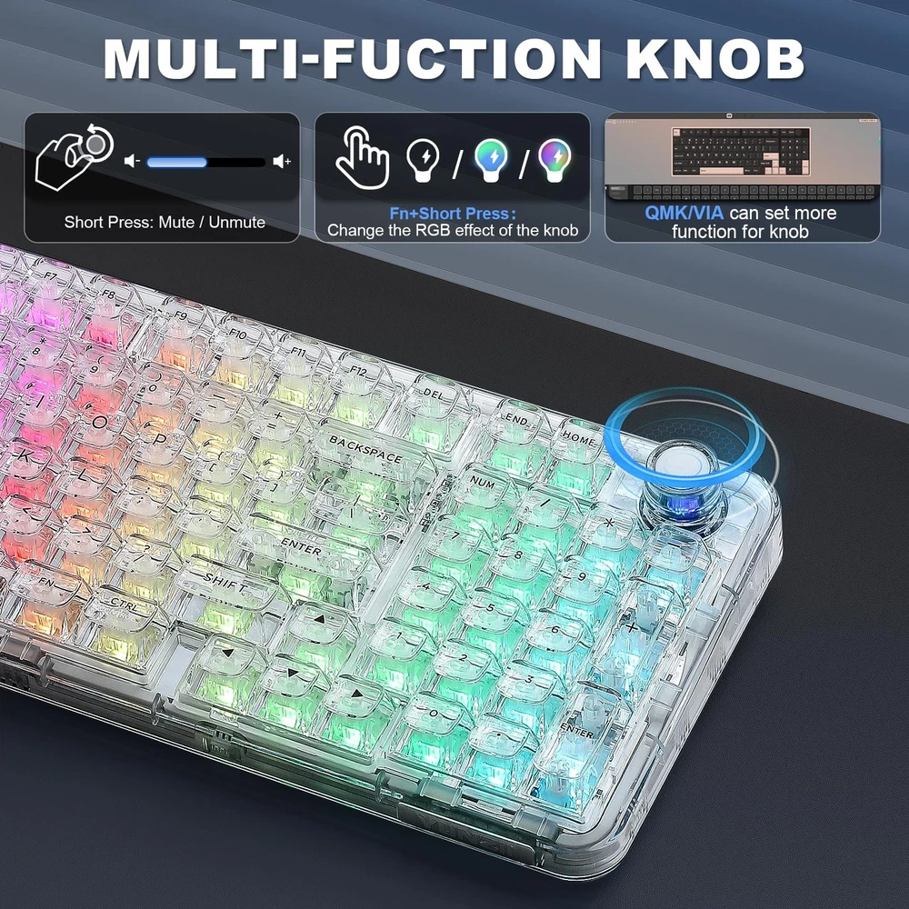 YUNZII X98 QMK/VIA Wireless Mechanical Gaming Keyboard with Knob,Tri-Mode BT5.0/USB-C/2.4GHz Hot Swappable Keyboard,Pre-lubed Switches Gasket Mount RGB Backlit for Wins/Mac Tri-Mode Wireless Mechanical Keyboard for Multi Device:YUNZII X98 mechanical keyboard supports wired, 2.4GHz wireless, and Bluetooth connections. Type-C Wired mode ensures ultra-low latency for PC gaming keyboards enthusiasts, while wireles s and Bluetooth modes eliminate cable clutter, making your desk cleaner. The gaming keyboard can easily connect up to 5 devices, effortlessly switching between laptops,chromebook,desktop,monitors. QMK/VIA Custom Keyboard with Knob:YUNZII X98 is a 98% layout mechanical gaming keyboard featuring QMK/VIA open-source firmware and a function knob. Unleash your creativity with full customization: remap keys, change layouts, create macros, adjust RGB effects, and customize the rotary knob (default: volume). Easily configure multiple profiles for different games or work settings. Hot Swappable Keyboard with Pre-lubed Switches:X98 Custom keyboard features a hot swappable socket compatible with 3-pin and 5-pin mechanical switches. Equipped with pre-lubed Snow Switches, the pre-lubed switches of the creamy mechanical keyboard offers silky-smooth, creamy typing and quiet actuation, perfect for users who wants out-of-box creamy and reliable performance. Gasket Mount Keyboard with Satisfying Sound: Experience a milky, creamy acoustic profile with X98 gasket mount keyboard, which composed with 5 layers of dampening materials (Poron, IXPE, Silicone, and Sound Enhancement Pads). The gasket structure of the PC gaming keyboard better optimizes resilience and stability, offering a softer, more elastic hand feel with a solid keystroke response. Crystal Clear Keyboard with Vibrant RGB: X98 transparent keyboard crafted from high-transparency PC material, the clear casing and shine-through keycaps maintain purity and clarity. Double-layer clear keycaps not only keep the crystal aesthetic appeal but also ensure anti-fading of keycaps characters. The RGB keyboard featuring with south-facing LEDs and 16.8 million colors, light up your gaming setups!