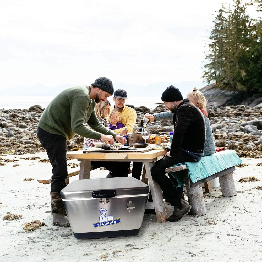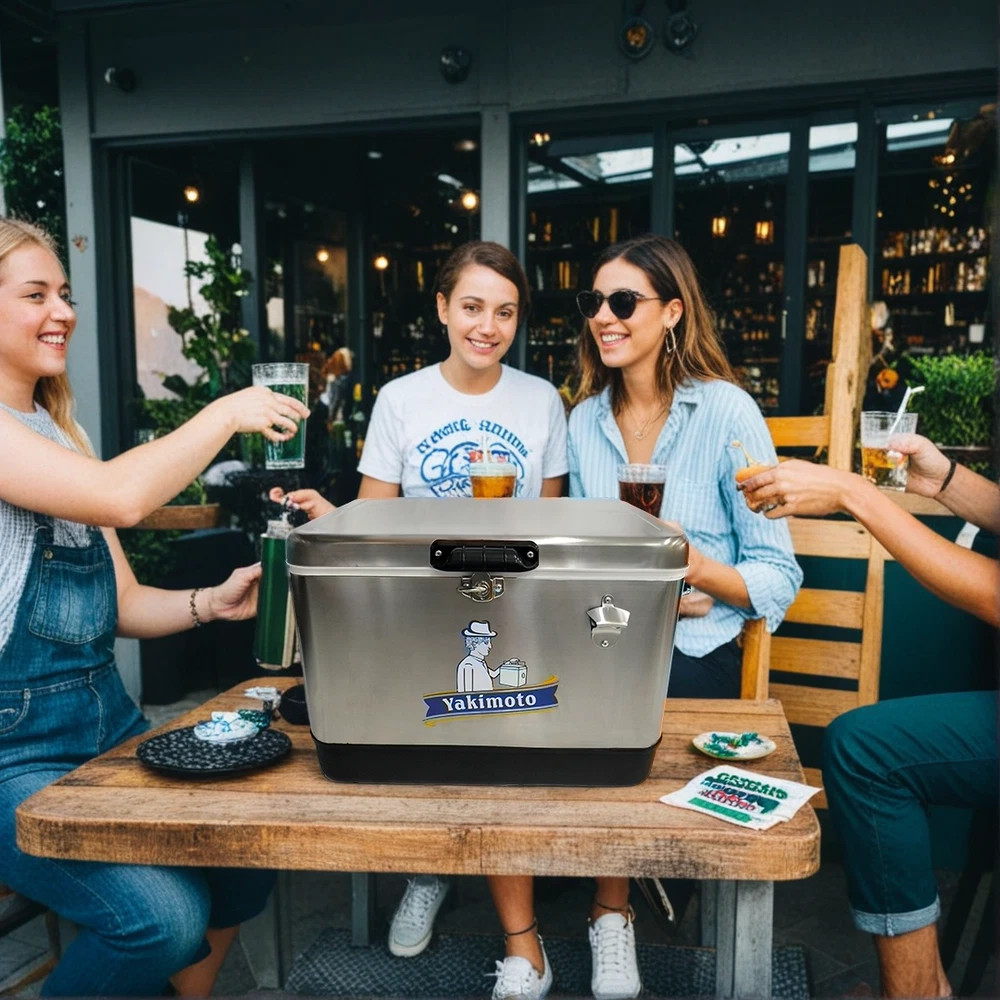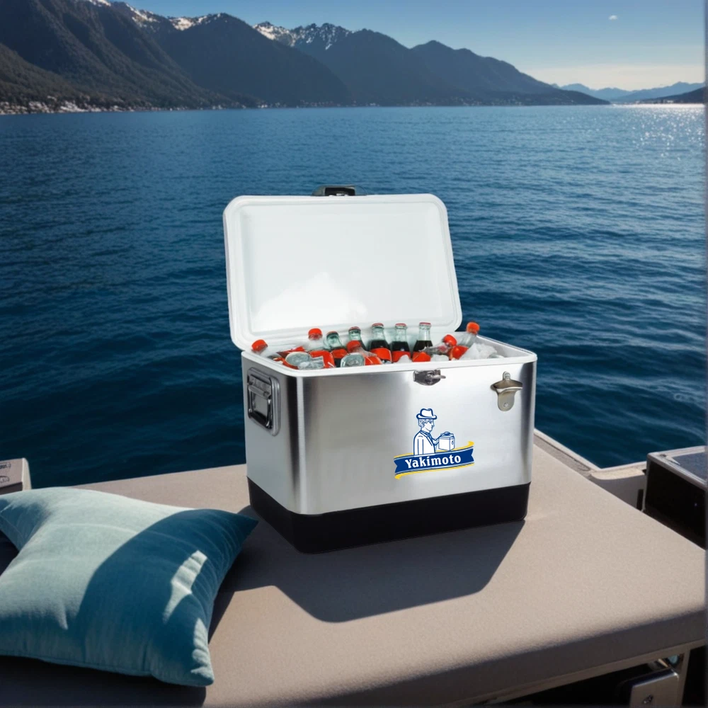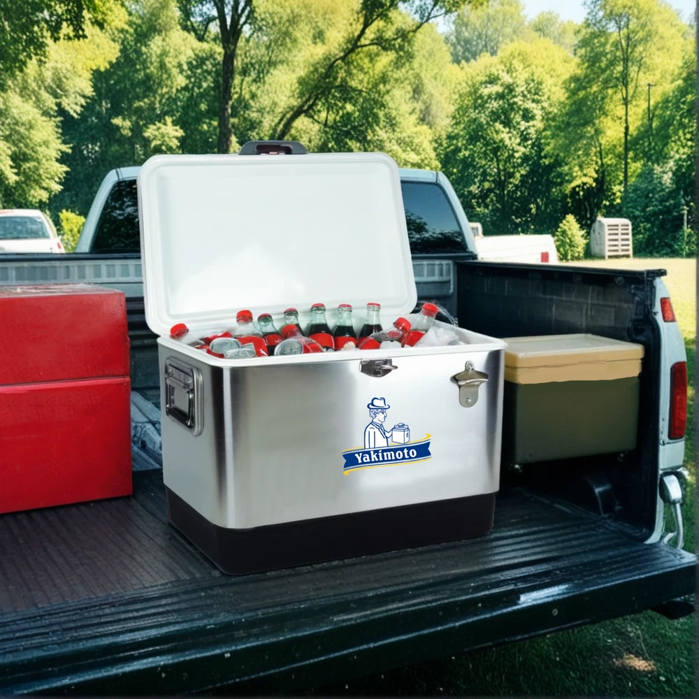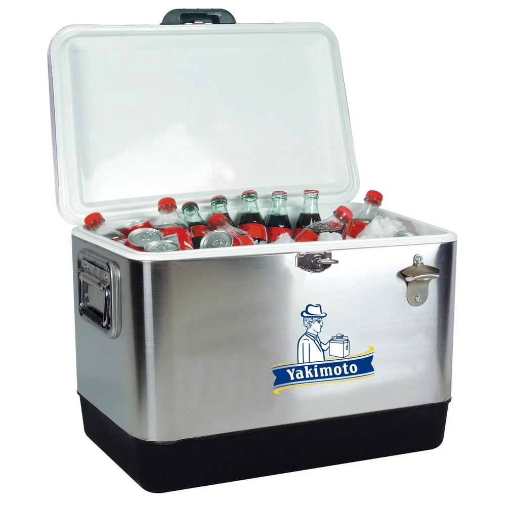 How does the cooler work? Our cooling technology is not comparable with other cool boxes. If you combine the Cooler Box Correct use, the temperature inside can be kept constant for many days - without power supply, in any climate zone, anywhere in the world. Product Information: Product Name: Waterproof Metal Ice Cooler 54 QT Yakimoto Vintage Stainles Steel Ice Chest Product Model: 2024JHH001 6 Capacity: 51 Liter Material: Stainless Steel+PU+Aluminium Size(Inch): 23.6 " x16. 5 " x16.3 ", Size(Cm); 60x42x41.5 cm Packing: Each piece in a carton Meas.: 62x43x47.5 cm G.W/N.W: 7.3/8.5 KG S · Huge 51 L (54 qt) Capacity: Portable ice chest features a generous 51 liter (54 quart) capacity that can hold up to 85 standard soft drink cans so you have room for whatever you need · Built-In Bottle Opener: This cooler features a bottle opener conveniently attached to the outside so you don?t have to scramble or search when you want a cold one · Eco-Friendly Cooling On the Go: Environmentally-friendly cooler features premium insulation and a securely locking steel latch to keep your drinks and snacks cool without electricity · Durable Construction: Expert craftsmanship and quality materials including rustproof stainless steel exterior and a rugged plastic base mean this ice chest is in it for the long haul · Easy to Clean: Stain-resistant food-grade plastic lining and leak-proof channel drain for no-tilt draining make emptying and cleaning your cooler a breeze Product Description This durable 51L / 54 Quart stainless steel ice chest is the ideal personal cooler to keep your favorite foods and beverages chilled and ready to drink. Fill this insulated cooler with ice and pre-chilled drinks and snacks for environmentally safe storage without the need for electricity. The solid steel latch and non-toxic plastic liner trap cold air inside for maximum efficiency, and the leak-proof channel drain makes cleanup a breeze. With its durable stainless steel finish, easy-to-carry rubberized handles and built-in bottle opener, this ice chest is the perfect accessory for day trips, tailgating, boating, fishing, hunting, camping or your next backyard BBQ. Good helper for you when go outside. Featuring portable, it can be applied in various situations, when you go for a long-distance self-drive travel, or you go out for a picnic and camping, or you use it as a moveable medical cooler box, etc. There is no doubt it plays an important role in outside activities. Our high-quality cool boxes offer you maximum independence and optimum cooling without electricity. Thanks to innovative high-performance insulation and special temperature elements, food and drinks stay fresh or frozen for days. Perfect for camping, outdoor adventures and everyday use, our robust, easily transportable cool boxes combine sustainability and efficiency. Don’t hesitate to Choose This Cooler!
