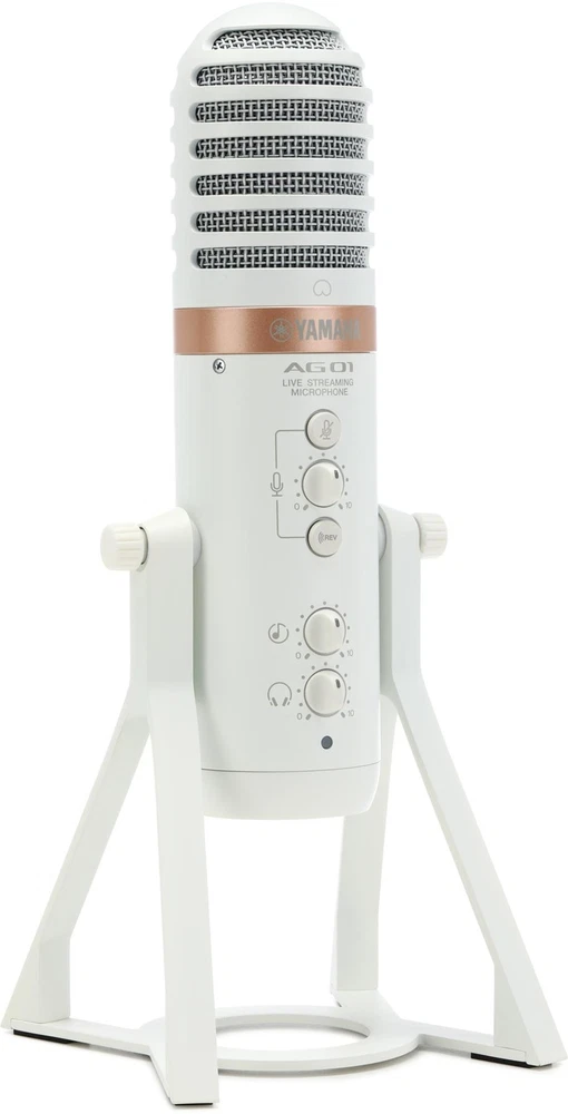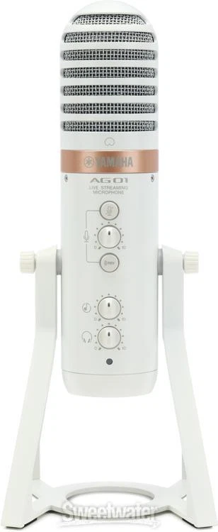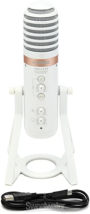 Full Streaming Suite — All from Your Mic With their AG series 3- and 6-channel mixers and USB interfaces, Yamaha has carved their own impressive niche in the realm of livestreaming. Now, they’ve unleashed the AG01 USB condenser microphone, a full suite of streaming options drawing directly from the capabilities of the AG series — all placed in one convenient spot. If you’re looking for a streamlined setup, then you only need to connect your headphones and a computer or an iOS/Android device, and you’re all set to stream. Of course, a host of onboard options grant you full control over your stream, including built-in DSP effects, a loopback function, a mixer, and additional input options. Additionally, you can pair your output with supplementary audio, all at stunning 24-bit/192kHz resolution.Loopback functionality for all-in-one streaming At Sweetwater, we understand that you are the most important part of your stream. Yamaha’s AG01 Sweetwater is an Authorized Yamaha Dealer Genuine New Item Sweetwater's 2-year warranty Yamaha AG01 Livestreaming USB Condenser Microphone - White Livestreaming USB Condenser Microphone, with Onboard DSP, Mixer, Loopback, and Flexible Input Connectivity - White Full Streaming Suite — All from Your Mic With their AG series 3- and 6-channel mixers and USB interfaces, Yamaha has carved their own impressive niche in the realm of livestreaming. Now, they’ve unleashed the AG01 USB condenser microphone, a full suite of streaming options drawing directly from the capabilities of the AG series — all placed in one convenient spot. If you’re looking for a streamlined setup, then you only need to connect your headphones and a computer or an iOS/Android device, and you’re all set to stream. Of course, a host of onboard options grant you full control over your stream, including built-in DSP effects, a loopback function, a mixer, and additional input options. Additionally, you can pair your output with supplementary audio, all at stunning 24-bit/192kHz resolution. Loopback functionality for all-in-one streaming At Sweetwater, we understand that you are the most important part of your stream. Yamaha’s AG01 condenser microphone is the ideal all-in-one streaming solution that saves you the stress of a complicated setup, thanks to its built-in loopback function. This allows you to incorporate external audio sources — via USB or one of the 1/8-inch, 4-pole mini jacks — alongside whatever is being picked up by your microphone, all into one stream. Loopback can be easily toggled and adjusted directly from the microphone, whether it’s music from your laptop/PC, mobile device, or even another mic. Onboard DSP lets your voice be heard, your way Streaming has become a ubiquitous activity, and it's more important than ever to strive for pro-level audio. The AG01 offers zero-latency DSP effects, including onboard compression, EQ, reverb, mute, and mic gain functionality. Because the AG01 is class compliant for iOS use, you can take even greater control of your audio arrangement. This is due to the AG DSP Controller app, which features “1 touch” and “expert” modes — both provide varying degrees of fine-tuning capabilities for all the onboard DSP effects. Furthermore, these can be applied to any supplementary audio, thanks to the AG01’s flexible input connectivity, sending out your stream at high-resolution, industry-standard 24-bit/192kHz quality. Yamaha AG01 Livestreaming USB Condenser Mic Features: Self-contained design lets you stream with a full suite of options right out of the box, with nothing more than a set of headphones and an Internet-connected computer or mobile device Condenser microphone ensures high-resolution audio at 24-bit/192kHz Built-in mixer keeps control close by and easily accessible USB connectivity means simple, immediate streaming with any laptop, PC, or iOS/Android device Zero-latency DSP effects provide quick, flexible control of compression, EQ, reverb, mute, and mic gain iOS class compliance grants even greater fine-tuning of DSP effects, thanks to the AG DSP Controller app Loopback functionality allows for full control and incorporation of supplementary audio, alongside microphone input Varied inputs include 1/8-inch, 4-pole mini jacks and USB, permitting additional audio from a computer, mobile device, or even another microphone Specification Detail Microphone Type Back Electret Condenser Polar Pattern Cardioid Frequency Response 30Hz-20kHz A/D Resolution 24-bit/192kHz Max SPL 110dB SPL Sensitivity -34dB ±3dB Color White Features Mute Button, Loopback Function Connector 2 x USB-C (host, 5V power), 1 x 1/8" TRRS (in/out), 1 x 1/8" (aux), 1 x 1/8" (headphones) Software AG Controller, Cubase AI, WaveLab Cast, Cubasis LE, Rec'n'Share Power Source USB bus powered / 5V USB power adapter (sold separately) Dimensions 11.1" x 4.6" Weight 2.6 lbs. Included Accessories USB Cable RETURN INFORMATION We want you to be completely happy with your purchase from Sweetwater. If you are not satisfied with your product, you may return it for a refund of the purchase price within 30 days. If your purchase was eligible for Free Shipping, the shipping cost will be deducted from your credit or refund. Returns must be in the complete and original packaging with all accessories and complete documentation (Owner's Manual, warranty card, quick start guides, etc.), show no signs of wear or use, and include a Return Authorization number or be subject to a restocking fee.