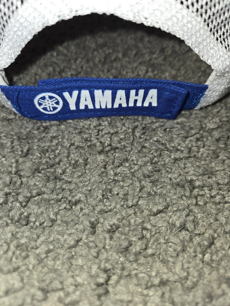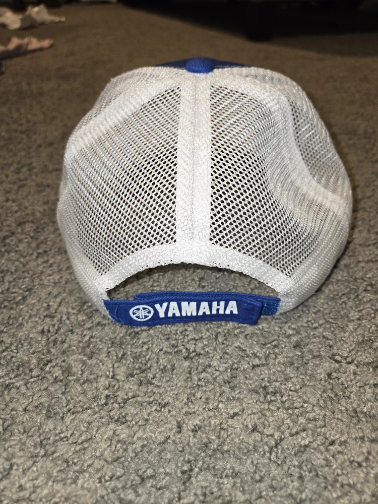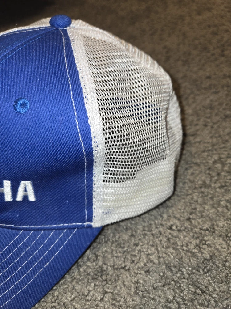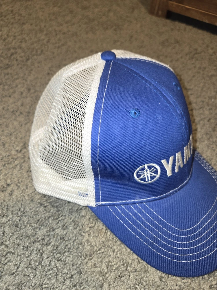 This is a blue Yamaha trucker cap featuring the brand's white logo on the front. Made of cotton canvas, it has an adjustable loop and hook back for a comfortable fit. The cap is designed in a casual baseball style, suitable for men to wear during the summer, fall, and spring seasons. It is a one size fits all accessory manufactured in Bangladesh.