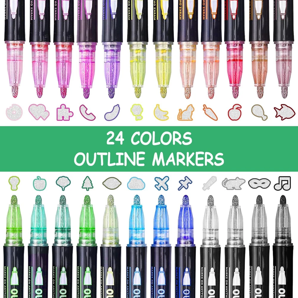 / π [ Best Gift for Kids And Adults ] - Yangmei Outline Pens is the best gift for kids. Ideal gift selection for Valentines Day Gifts for Kids, Easter Basket Stuffers for Teens, Christmas, Children's Day, Thanksgiving and Halloween, Stocking Stuffers for Kids Teens. Children will love to paint with Yangmei shimmer markers, they will always create amazing works of art with colored pencils. π¨ [ Three Writing Effects ] - Our shimmer markers have unique automatic double line function. When you write on light and white paper, you can draw two lines at the same time, metallic silver and colourful. Paint on dark/black paper, it shows only silver colours. When you paint on a smooth surface, it only shows the colourful colour. π¨ [ Strong Glitter Effect ] - 24 bright colours with double line and glitter effect. All colours glide smoothly on the double line pens with fibre tips. The unique technology automatically creates contours to achieve a beautiful two-tone effect. These glitter pens give your creations a brilliant look with glitter, metallic or neon colours. π¨ [ Widely Used ] - Outline markers pens are suitable for DIY crafts such as art supplies, easter basket stuffers, photo album, guest book, christmas gifts card, scrapbooking. Also for almost all surfaces such as stones, wood, glass, metal, plastic, whiteboard and ceramic. This 12 outline pens add a sparkling embellishment to various crafts. π¨ [ Safe and Non Toxic ] - The shimmer marker has been made with a particularly wear-resistant and pressure-resistant ultra-fine nylon tip that allows for smooth writing. Non-toxic, odourless, waterproof, environmentally friendly. Adults and children can use it safely.
