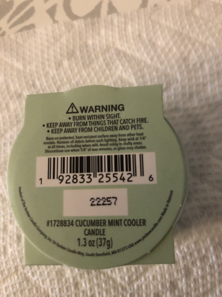 Care Instructions: Easy Care Manufacturer Color: Green Type: Mini Candle Theme: Holiday, Seasonal, Autumn, Fall, Spice, Multiple Handmade: No Burning Time: Approx 7-10 Hours gtin13: Does not apply Style: Traditional Features: Scented, Single Wick Power Source: None Character Family: Multiple Size: Mini Shape: Jar Custom Bundle: No Personalize: No Customized: No Scent: Cucumber Mint Cooler Room: Bathroom, Bedroom, Dining Room, Entryway, Foyer, Guestroom, Kitchen, Living Room, Sunroom, Any Room, Den, Hallway, Office, Patio, Study Brand: Yankee Candle Product Line: Yankee Candle Mini Jar Candles Item Weight: 1.3 oz. Color: Green UPC: Does not apply Character: Multiple Bundle Description: 1 Material: Wax, Soy Wax Blend Number in Pack: 1