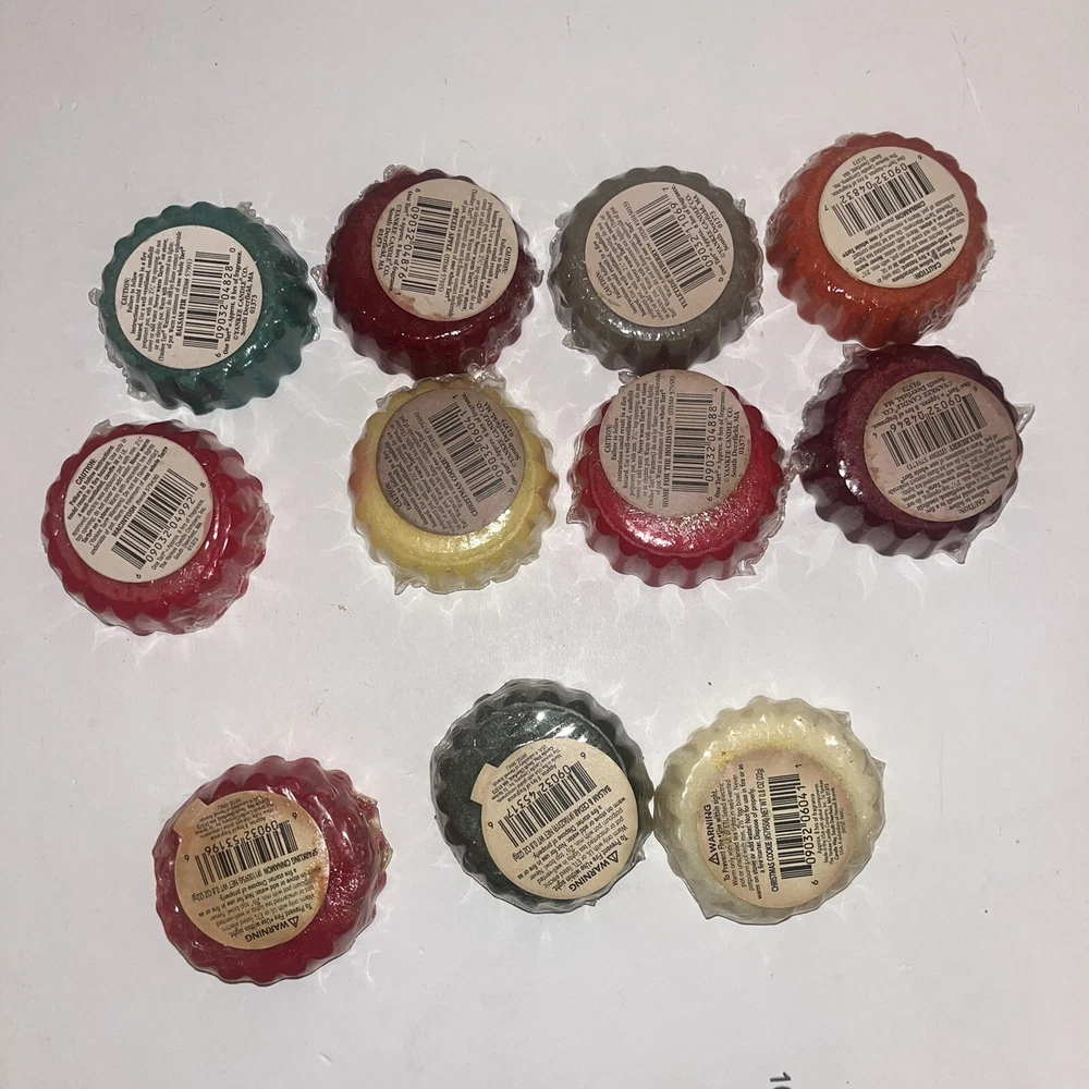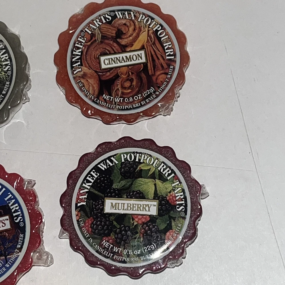 Yankee Candle Tarts 22g Mixed Lot of 11: Balsam Fur, Spiced Apple, Yuletide Bayberry, Cinnamon, Macintosh, 2 Christmas Cookie, Home for the Holidays, Mulberry, Sparkling Cinnamon, and Balsam Cedar. Each tart has its original cellophane wrapper. Some have a sticky label. Scent is still strong.