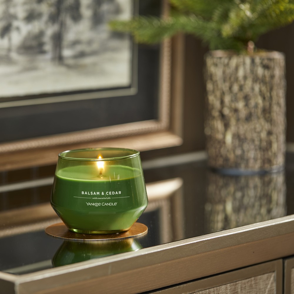 Balsam, aromatic cedar wood, and juniper berry blend together in a fresh forest scent. The Yankee Candle® Studio Collection is intentionally designed to fit seamlessly into your home. Each of these simply sophisticated, colored glass candles offers high-quality Yankee Candle fragrances made with essential oils. They can help create welcoming ambiance that makes everyday moments special for you and your loved ones. Premium soy-wax blend Wick made with natural fibers Burn Time: 40-65 hours Beautiful colored glass candle Yankee Candle Studio Collection Balsam & Cedar Balsam & Cedar: Balsam, aromatic cedar wood, and juniper berry blend together in a fresh forest scent