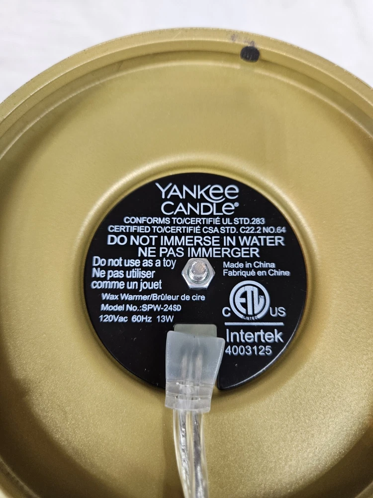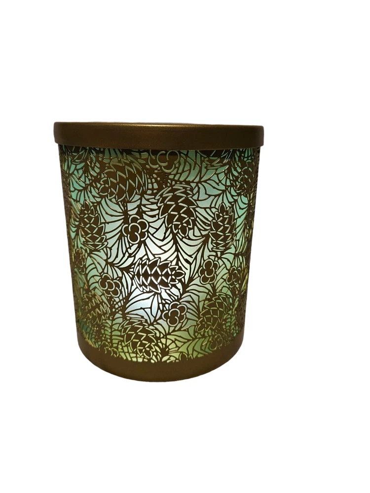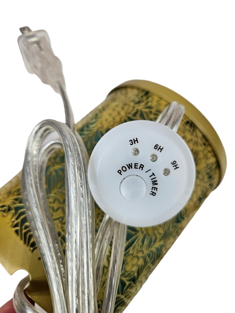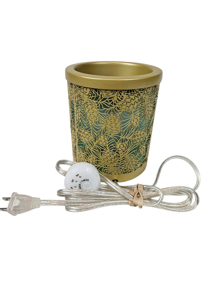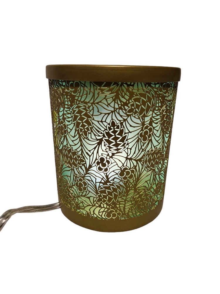 Yankee Candle Gold & Green Pinecone Scenterpiece Electric Glowing Wax Warmer In like new condition Yankee Candle Gold & Green Pinecone Scenterpiece Electric Glowing Wax Warmer. With an electric lit candle inside, this frosted scenterpiece warmer comes to life with flickering and glowing pinecones. Balsam Branches A fall and winter delight! With a timer power cord, you can place this warmer just about anywhere you like. It’s so easy to change scents in seconds—to match your mood, your day, your crazy busy life. Yankee Candles innovative Easy MeltCups release room-filling fragrance for enjoyment in just minutes. Place an Easy MeltCup in the Scenterpiece® warmer and turn it on. That’s it (really!). When you’re ready to change scents, pick up the cool-to-the-touch MeltCup and switch it out for another one. No wax to touch, no wax to clean. Easy MeltCups stack and store easily…bonus! Features quicky change fragrances with heat resistant meltcups, flameless warmer provides room filling fragrance, indicator light illuminates when warmer is on, automatic shut off (3, 6, or 9 hour setting), LED lights creates added ambiance, no messy clean up. Measurements height 6" diameter 5.25" This is a pre-owned item that may show signs of wear. In like new condition, no flaws.