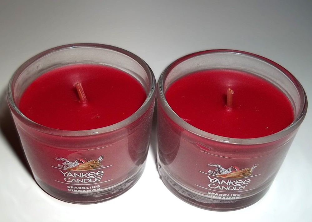 Item Weight: 1.3 oz Type: Votive Candle Brand: Yankee Candle Shape: Round Number in Pack: 2 Burning Time: Up to 15 Hours Scent: Sparkling Cinnamon Handmade: No Style: Traditional Material: Wax Features: Scented, Single Wick, White Bottom Label Personalize: No Color: Red Model: Votive Room: Any Size: Mini