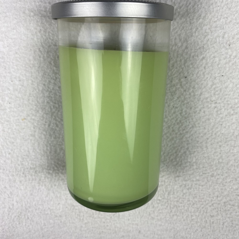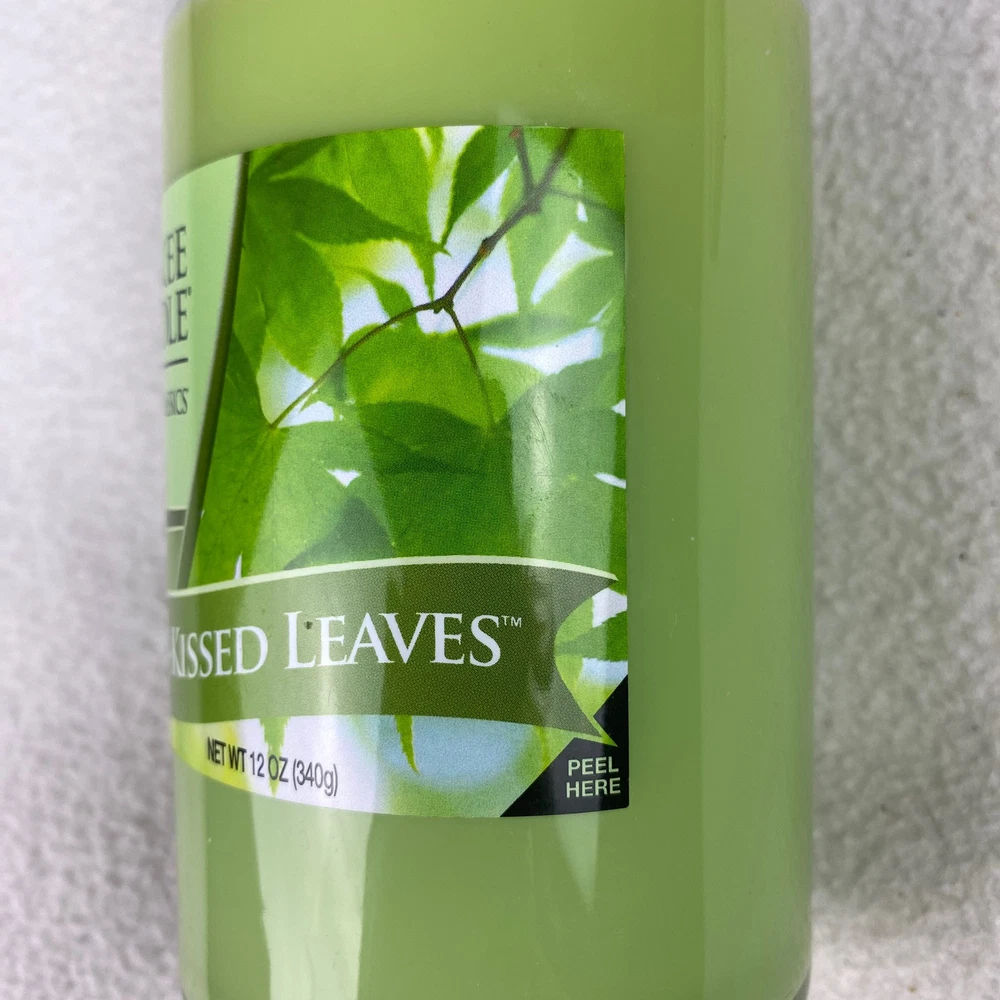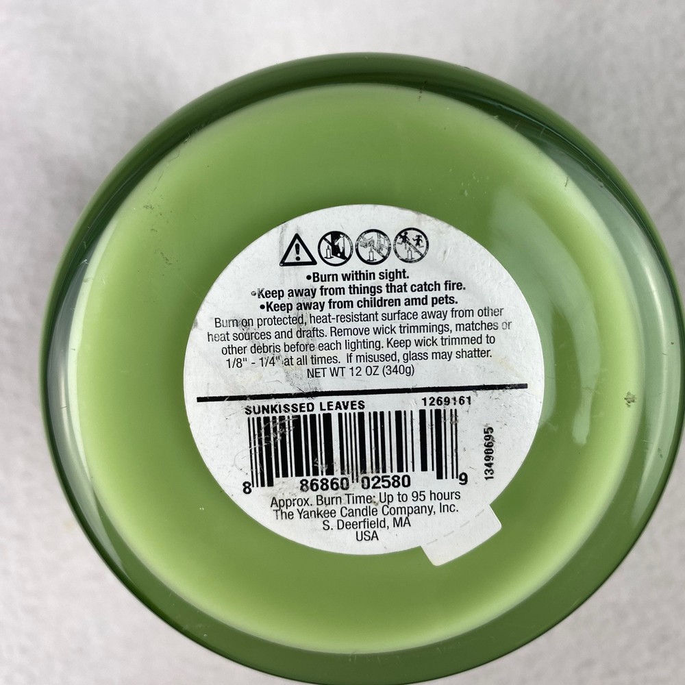 The product is a Yankee Candle in the scent "Sun-Kissed Leaves" in a 12 oz green jar. It is a discontinued scent from the Home Classics line, making it a unique find for candle enthusiasts. The jar/container candle features the signature Yankee Candle branding, offering a refreshing and aromatic fragrance that evokes the essence of sun-kissed leaves.