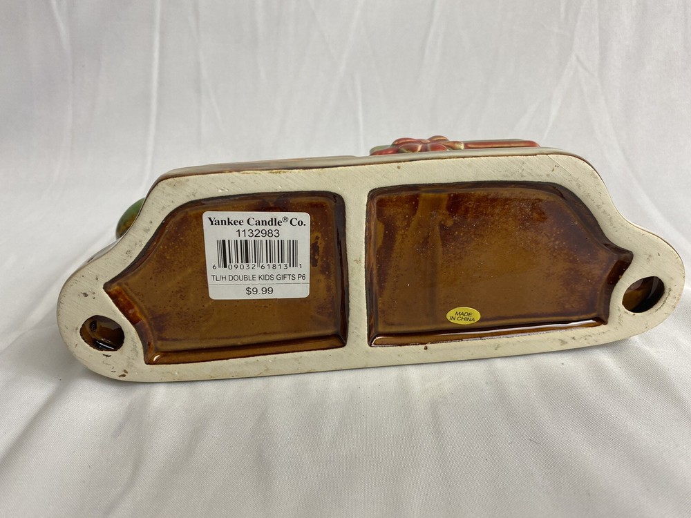Size:SmallSuitable For:FurnitureHandmade:NoRoom:Any RoomColor:Brown, Red, GreenFeatures:3D EffectProduction Technique:PotteryFinish:GlossyStyle:Winter And ChristmasMaterial:Ceramic & PorcelainItem Height:approx 4.5"Engraved:NoUPC:Does not applyDepartment:KidsOrigin:MassachusettsCare Instructions:Clean with Dampen ClothItem Width:3.5”Character Family:Children and giftsCountry/Region of Manufacture:UnknownSubject:ChildrenVintage:Nogtin13:Does not applyCharacter:Boy And GirlPattern:PresentsOccasion:ChristmasType:Tea Light Candle HolderItem Weight:1lb 8 OzsModified Item:NoTime Period Manufactured:UnknownNumber in Pack:1Item Length:8”Original/Reproduction:Licensed ReproductionShape:RectangleTheme:ChildrenScent:TeaAdditional Parts Required:YesBrand:Yankee Candle