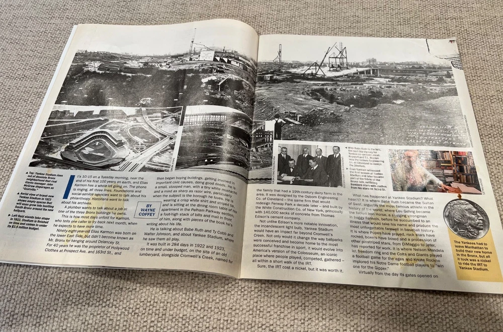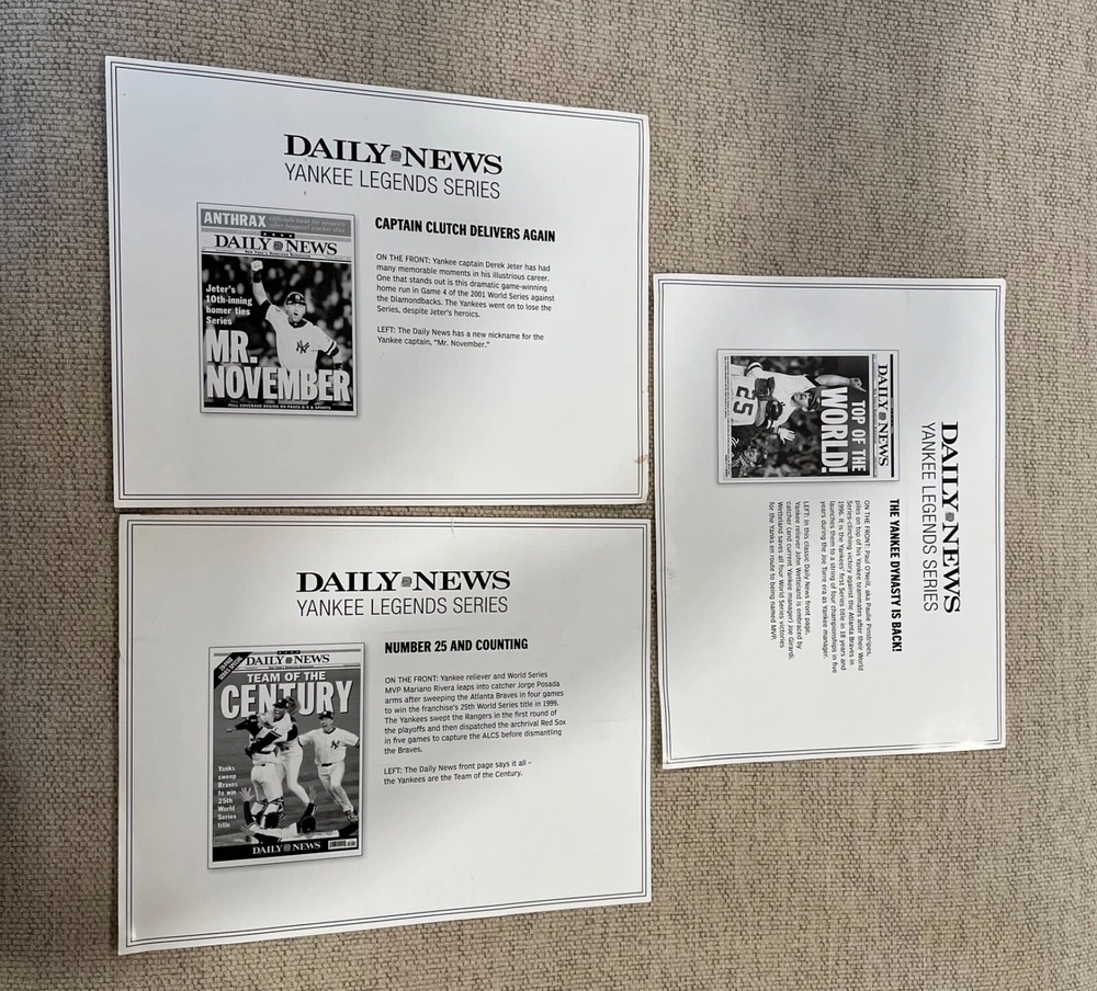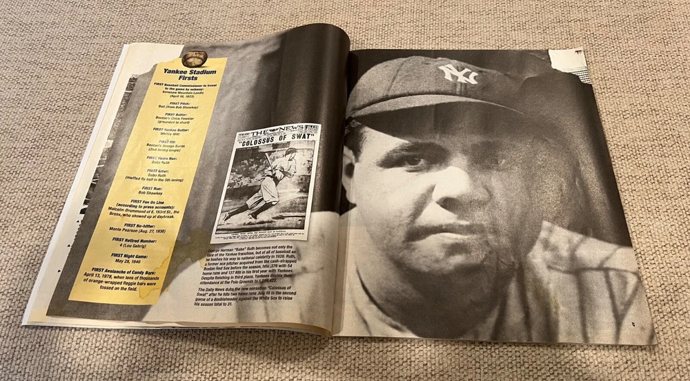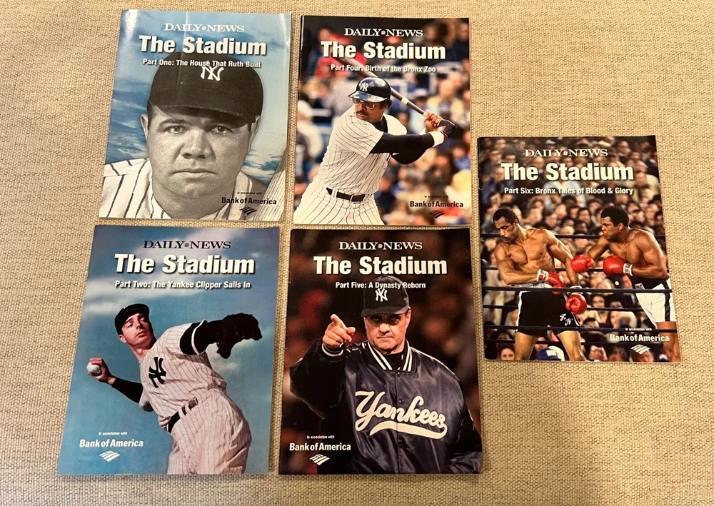 2008 Daily News The Stadium magazine containing parts 1,2,4,5,6. Missing part 3. Part 1 with Babe Ruth has a few pages with stains-see pics. Lot also contains 3 Yankees pages from the daily news. Page with Mariano Rivera and Jorge Posada has a small rip on the right side. This lot also has Baseball’s Great Dynasties the Yankees which is a nice collection of Yankees history including Babe Ruth, Lou Gehrig. Yogi Berra, Reggie Jackson and many more!