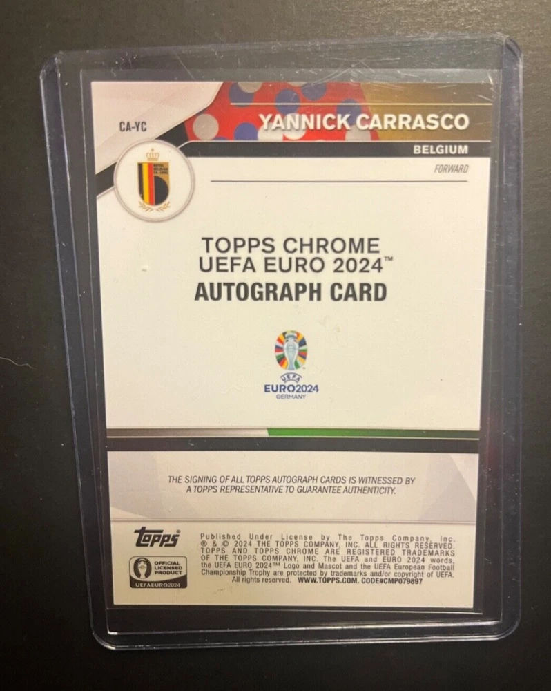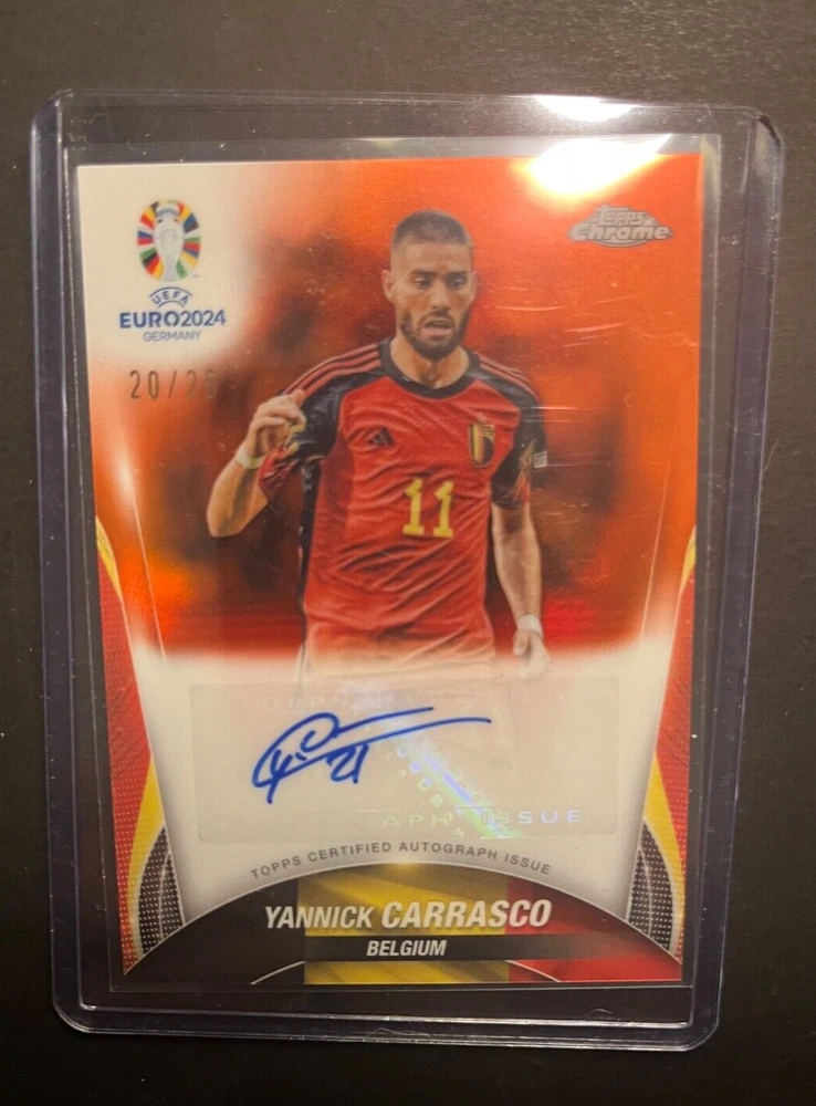 Elevate your sports card collection with the Yannick Carrasco EURO2024 Topps Chrome Orange Auto /25, card name CA-YC. This exclusive card features the Belgium soccer player and is a must-have for fans and collectors alike. The limited edition orange parallel variety adds a unique touch to this memorabilia, complemented by Carrasco's authentic autograph, verified by Topps. As a cherished piece from the 2024 Topps Chrome set, this card captures the essence of the UEFA European Championships. It's a tangible piece of soccer history that celebrates both the player's achievement and the sport's international appeal. Whether for your personal collection or as a gift, this card is a standout representation of sporting excellence.