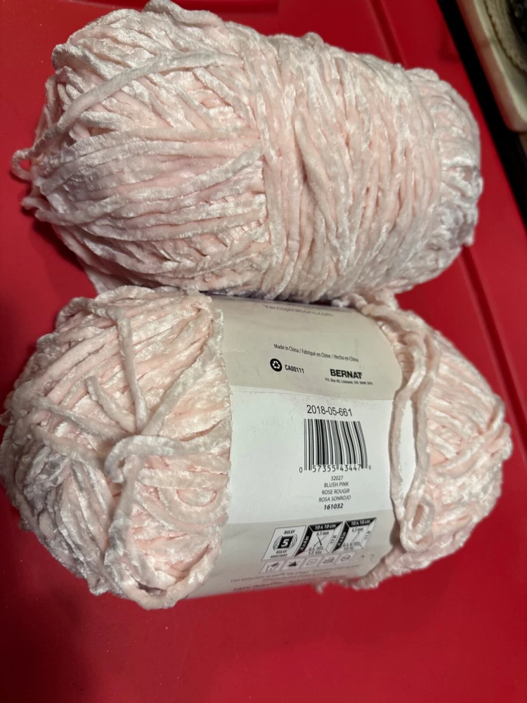 2 Skeins (or almost; one wrapper is missing) of Yarnspirations Bernat Velvet Yarn, Color Blush Pink. 1 skein is 220 yards. From the Yarnspirations website: A luxurious, soft, cozy yarn, Bernat Blanket is a chenille-style yarn perfect for home décor projects. From blankets, to crochet baskets, Blanket is ideal for a wide range of projects. Its super bulky weight stitches up quickly, making it a great choice for Afghans and blankets. Available in a wide range of solid and variegate shades to compliment your home décor. Coveniently machine washable and dryable.