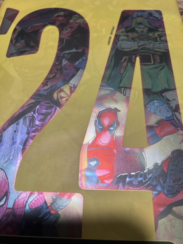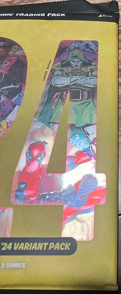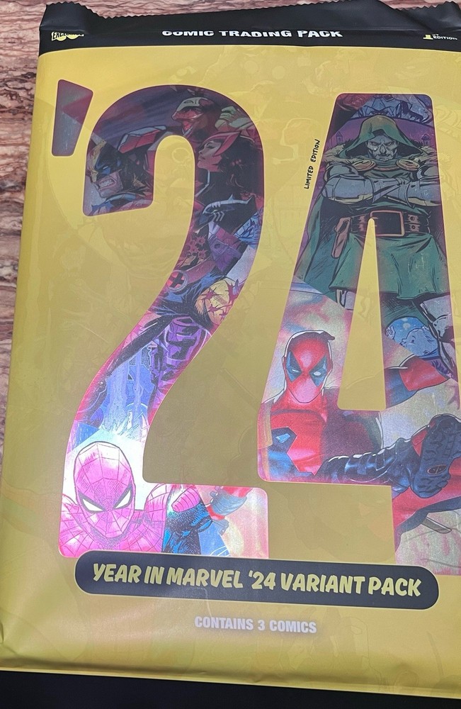 If you get all 3, I will send the box the 3 packs came in as well… The "Year in Marvel '24 Variant Comic Trading Pack NYCC Exclusive Whatnot" is a limited edition comic book lot featuring exclusive covers from popular Marvel superheroes like Deadpool, Dr. Doom, and Wolverine. This mixed lot of 3 comic books, part of the Marvels series, was released at the New York Comic Con event and includes art by acclaimed artists such as Marco Checchetto and Frank Martin. The colorful comics, with a modern age era and action-packed storyline, are perfect for general audiences and fans of the Marvel Universe.