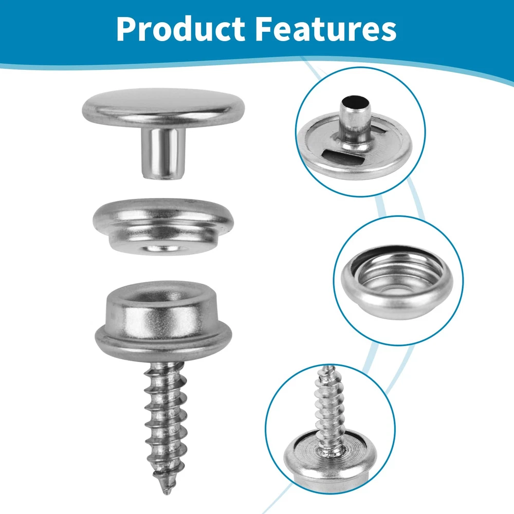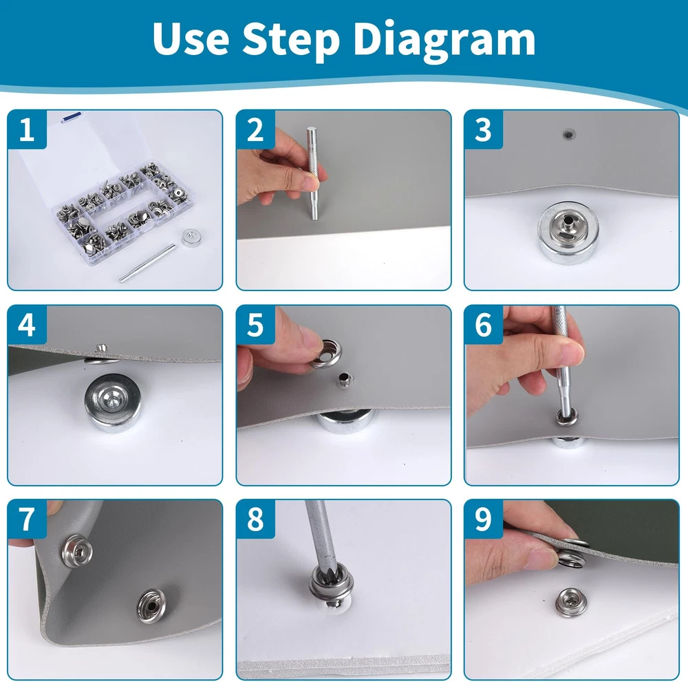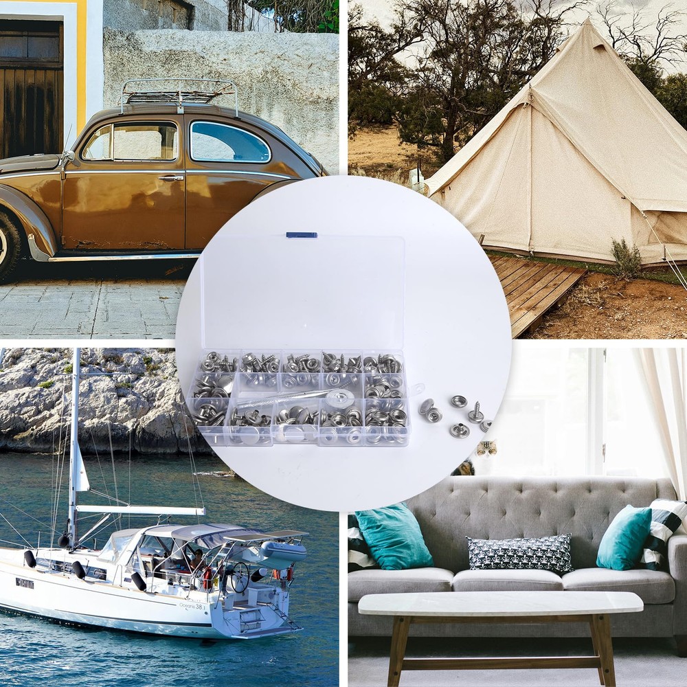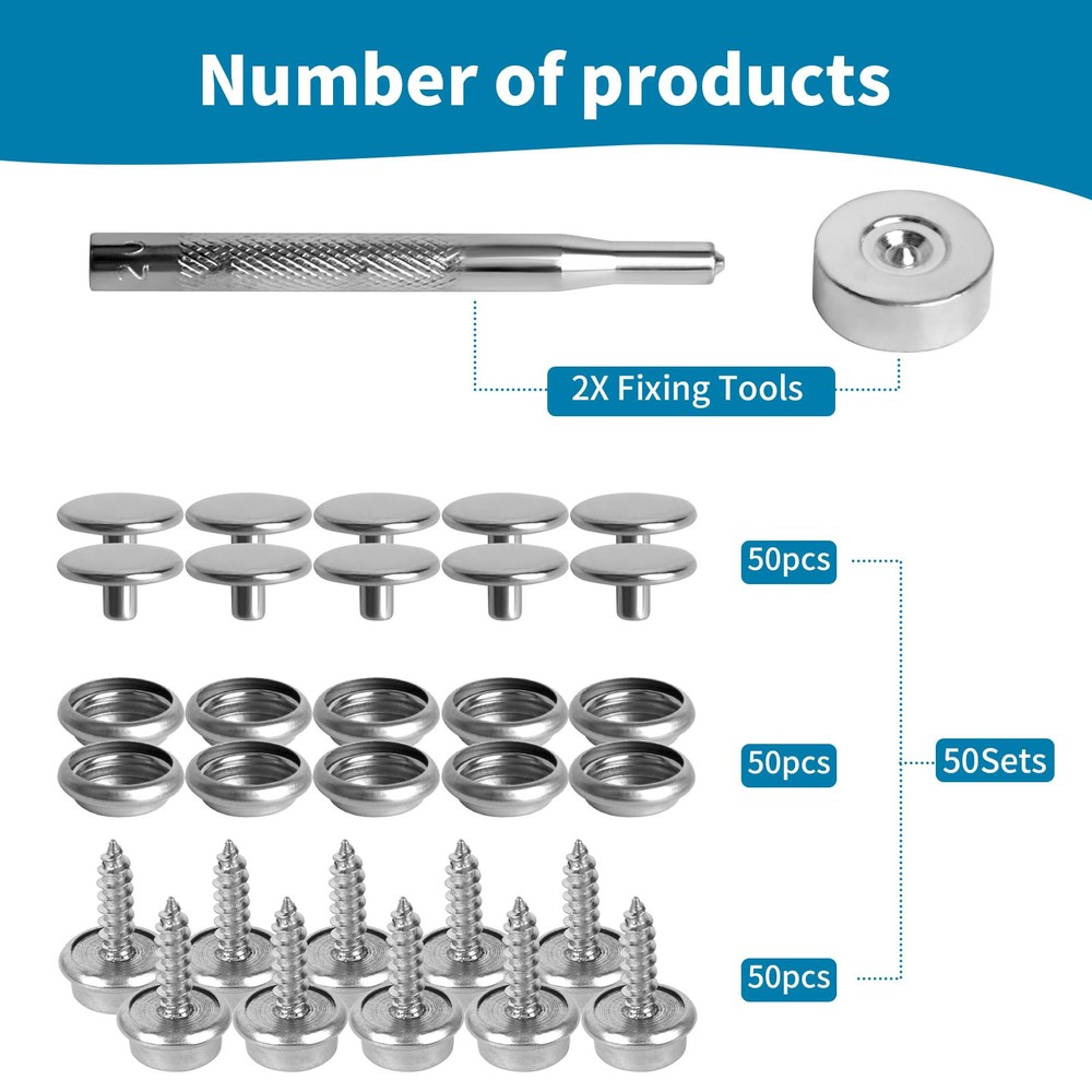 Package 50 pieces x socket 50 pieces x hats 50 pieces x screws (10mm) 20 screws (15mm) 1 x anvil 1 x expanding tool 1 x storage box Features 1.Material: stainless steel 2.Color: black 3. Scope of application Metal snaps are widely used on canvas, carpet, leather, tent repair kits, awnings, canvas, lawn furniture, boat accessories, etc. It's a useful snap tool for your house, boat, tent or even camper. Can be used indoors and outdoors to meet your needs 4. As long as it is installed, it can be used for a long time and should not be dropped. It is sturdy and durable. When you purchase this product, you will receive 50 5/8-inch screws, 50 sockets, 50 covers, 1 x expanding tool and1 x anvil, stored in a plastic box for easy identification and storage. The snap repair kit is made of 100% new -high-quality stainless steel, which can prevent corrosion even in salt water and humid environments. The material is strong and durable, not easily damaged, and has a long service life. Suitable for construction in various environments. Metal snaps are widely used on canvas, carpet, leather, tent repair kits, awnings, canvas, lawn furniture, boat accessories, etc. It's a useful snap tool for your house, boat, tent or even camper. Can be used indoors and outdoors to meet your needs Easy to use: snaps for boat covers come in sets and are equipped with installation tools. The quantity is sufficient to meet the installation needs of any place. There is no need to worry about quantity issues. Not easy to fall: Just fix the mounting screws and caps on the items you need, use the mounting tools to fix them again, it will be very strong even if time passes, if you have any questions you can us