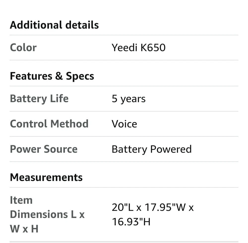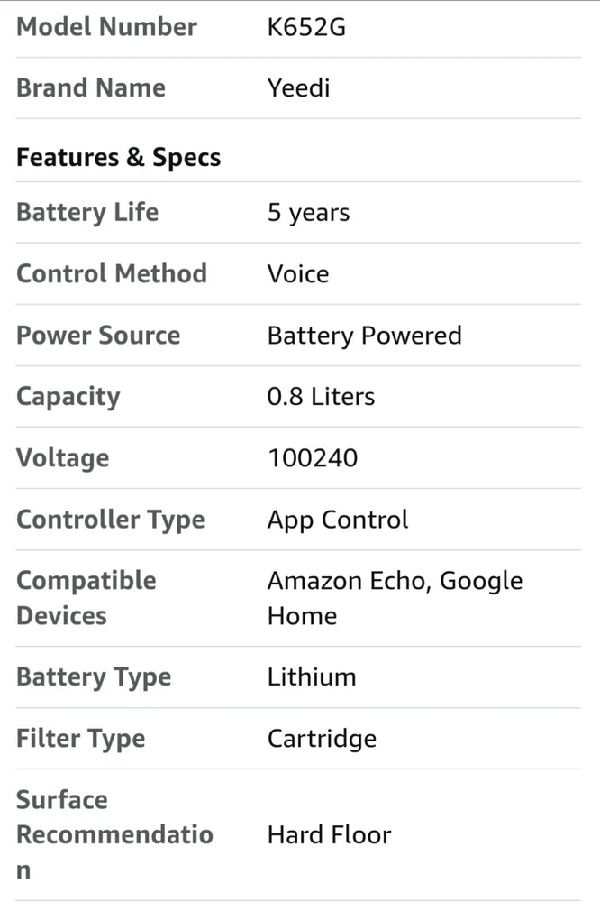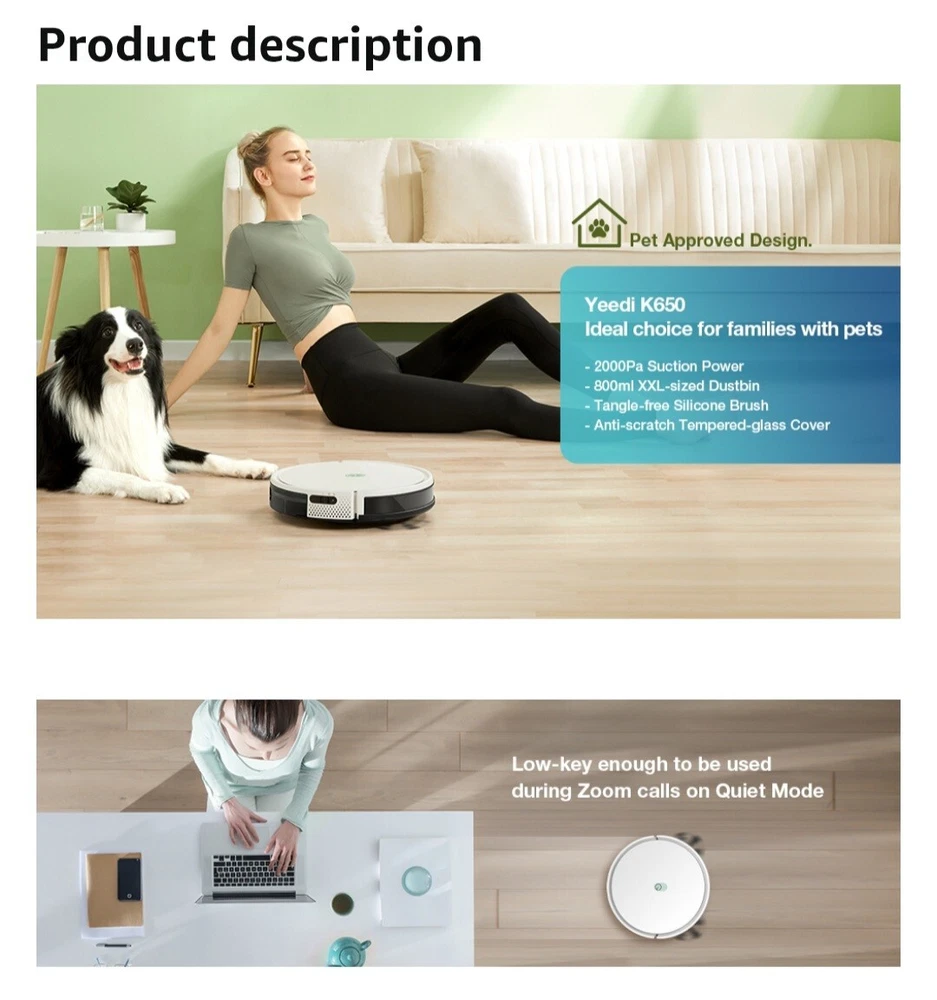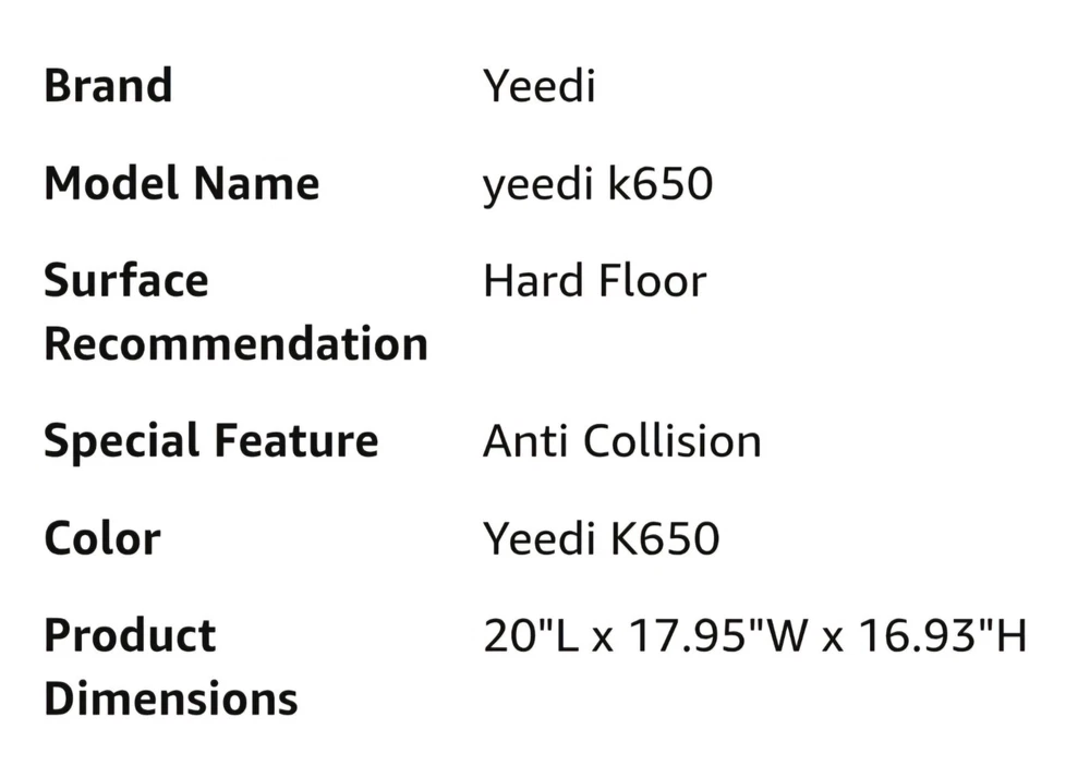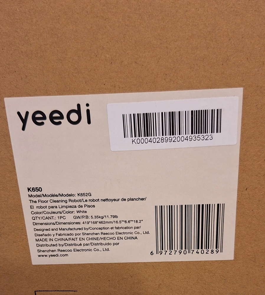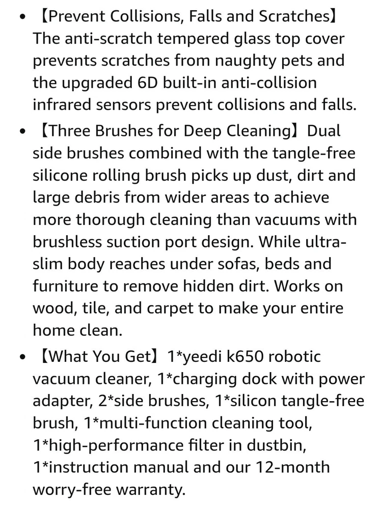 YEEDI K650 ROBOT VACUUM, WITH 2000Pa Wi-Fi ROBOTIC VACUUM CLEANER WITH THE 800ML BIGGEST DUSTBIN AND TANGLE-FREE BRUSH, 3 MODES, SELF-CHARGING, COMPATIBLE WITH BOUNDARY STRIPS...... *FEATURES * ■ MORE POWER LESS NOISE ■ IDEAL FOR PET FAMILY ■ SET YOUR BOUNDARIES ■ SMART APP AND EASY CONTROL ■ LONG-LASTING BATTERY & SELF-CHARGING ■ PREVENT COLLISIONS, FALLS, & SCRATCHES ■ THREE BRUSHES FOR DEEP CLEANING ● *WHAT YOU GET*: 1 YEEDI K650 ROBOTIC VACUUM CLEANER, 1 CHARGING DOCK WITH POWER ADAPTER, 2 SIDE BRUSHES, 1 SILICON TANGLE-FREE BRUSH, 1 MULTI-FUNTION CLEANING TOOL, 1 HIGH-PERFORMANCE FILTER IN DUSTBIN, 1 INSTRUCTION MANUAL, AND OUR 12-MONTH WORRY-FREE WARRANTY. ☆ *BRAND NEW SEALED BOX*