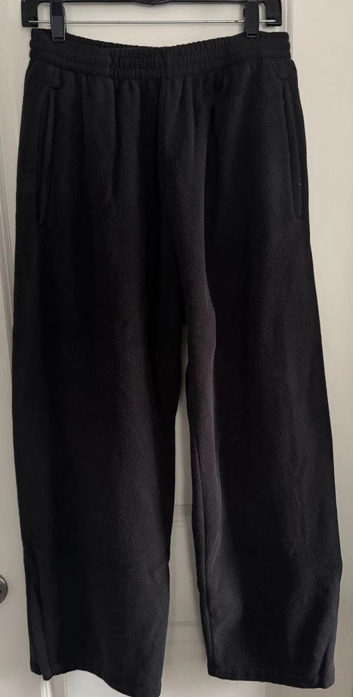 New in the bag with drawstring and zippers on the bottom. The Yeezy YZY x GAP H10 Polar Fleece Pants in black, size M, are a designer collaboration between Kanye West and GAP. These relaxed-fit sweatpants are made of polyester and cotton fleece, offering comfort and a heavyweight feel. The pants feature a straight leg style and are suitable for activewear, making them ideal for activities like gym training, track and field, and basketball. Perfect for the winter, fall, and spring seasons, these Yeezy pants combine style and functionality for a trendy addition to any activewear wardrobe.