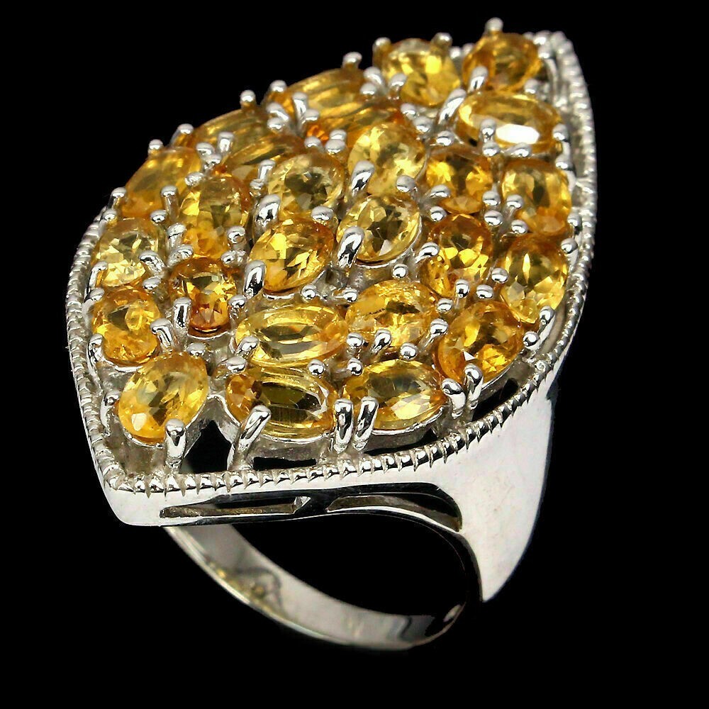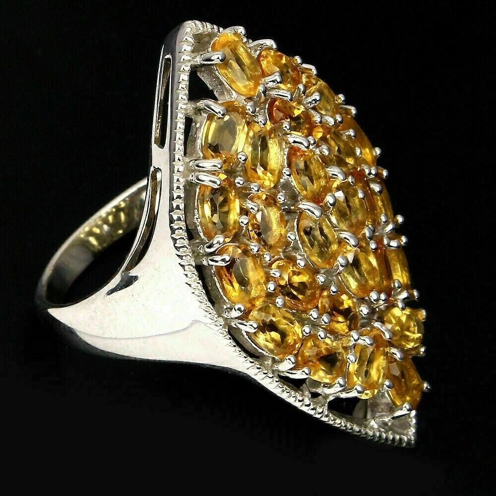 Solid sterling silver 925 stamped white gold coated cluster ring featuring oval cut faceted genuine natural mined golden citrine gemstones each measuring 5mm x 3mm set into a large cluster design. The face of the ring measures 37mm x 21mm and is a size Q 1/2 (US 8.5). GIFT BOXED Thanks for looking and please take time to view my other listings #10968