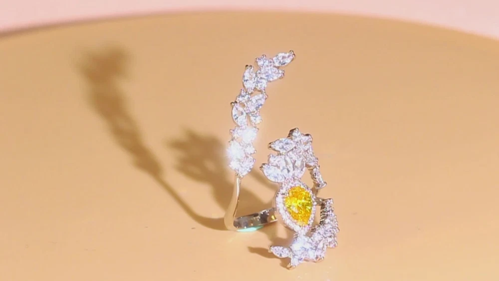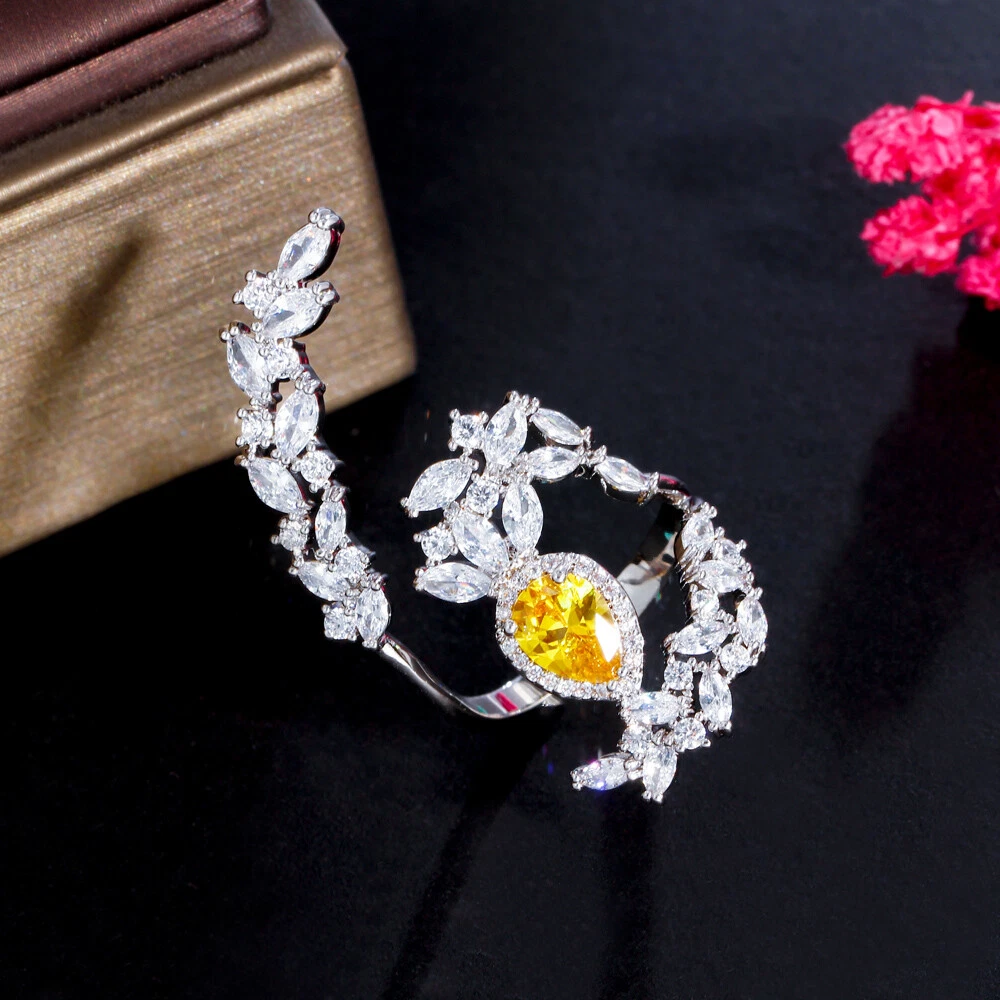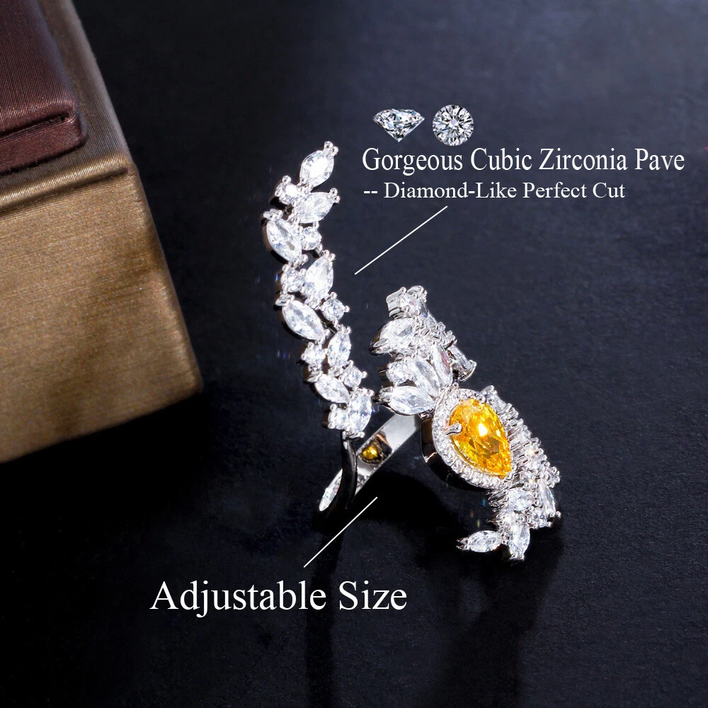 Main Stone Color: Yellow Main Stone: CZ / Cubic Zirconia Item Type: Big Leaf Drop Finger Ring Theme: Family & Friends Brand: CWWZircons Fit for: Brides , Women ,Girls , Wife , Mother Features: Gorgeous, Fashion, Luxury UPC: Does not apply gtin13: Does not apply Style: Classic Country of Origin: China Shape: Drop Type: Ring Color: Yellow Metal: Silver Plated Occasions: Dancing Party ,Wedding , Prom , Engagement Material: Cubic Zirconia Ring Size: Adjustable Base Metal: Copper Secondary Stone: Cubic Zirconia