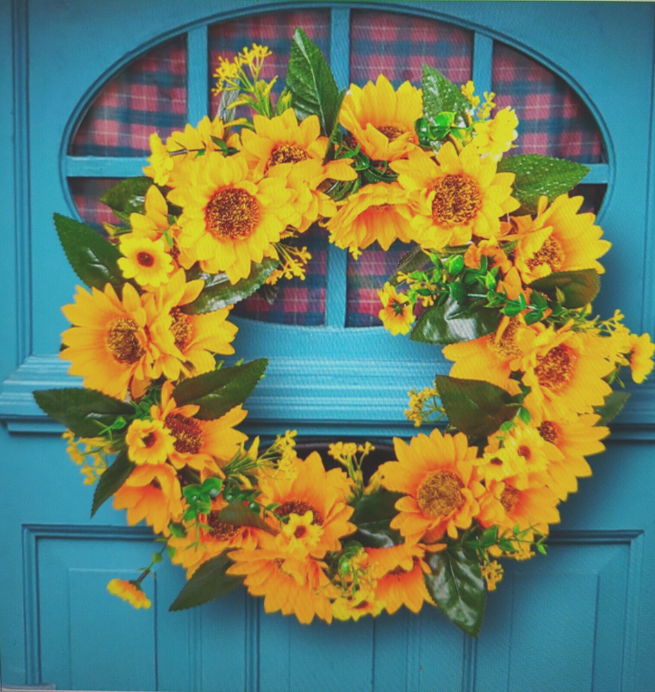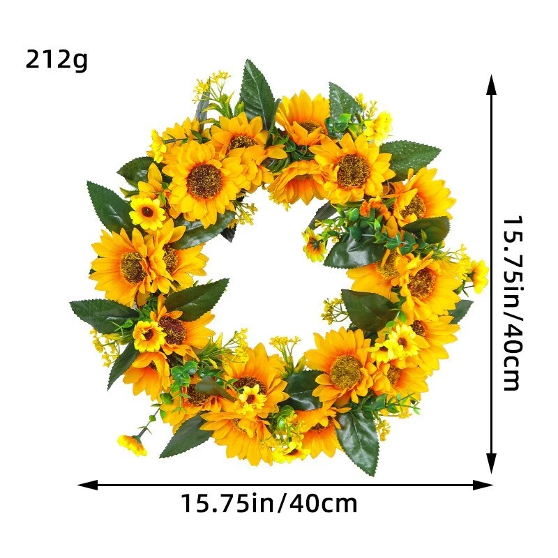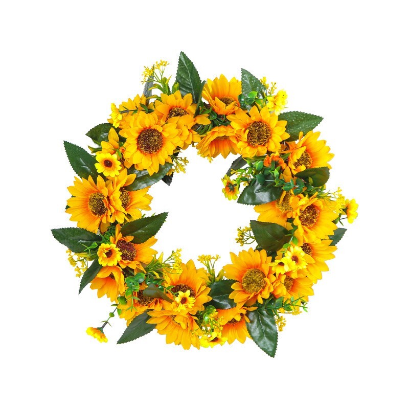 Add a touch of seasonal charm to your front door or porch with this beautiful yellow flower wreath. Crafted with artificial flowers, this wreath is perfect for all occasions and is sure to brighten up any space. The wreath is designed in the shape of a wreath and features a door decoration product that is perfect for adding a festive touch to your home. This wreath is made in China and is a great addition to any floral or home decor collection. Use it to add a pop of color and texture to your front door or porch, or simply as a decorative accent piece. Whether you're looking for a seasonal wreath or just a unique door decoration, this beautiful yellow flower wreath is sure to impress.