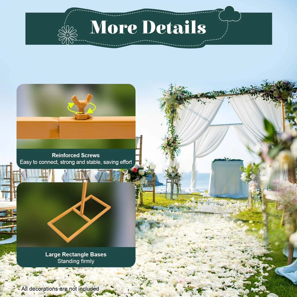 Specification Color: Gold Material: Iron Style: Classic, Elegant Shape: Square Process: High-temperature Baking Paint Assembly Required: Yes Adjustable Height: 1.09m/3.6ft, 1.97m/6.5ft, 3m/9.8ft Total Width: 3m/9.8ft Base Size: 52*23*2cm/20.47*9*0.8in Pole Size: 2*2cm/0.8*0.8in Package Size: 108.5*28*10cm/42.7*11*4in Gross Weight: 5.25kg/11.57lbs Net Weight: 4.7kg/10.4lbs Package Included 2* L-shaped Poles 6* Short Straight Poles 1* Long Straight Pole 2* Bases 1* English Manual Have a nice day~ Product Description Backdrop Stand Heavy Duty with Base Yellow Square Metal Arch Party Frame Our square arch stand is characterized by high-quality metal materials, which are designed to provide strong and balanced support in various indoor and outdoor conditions. Its yellow exterior and adjustable height can fit with such decorations as flowers, vines, balloons, and LED lights, which will make a wonderful memory. Features Sturdy and Stable With the square poles and butterfly screws, this high-quality iron arch is built to be more sturdy and stable, which can withstand outdoor use in various weather conditions. Height Adjustable The wedding arch features an adjustable design. Its height (3.6ft/6.5ft/9.8ft) can be adjusted by removing/adding poles, which is suitable for various backdrops. Large Base The large base with a size of 20.47*9in can stand firmly on the ground even in severe weather by putting sandbags (not included) on it. DIY Decoration The square wedding arch can be easily combined with other decorations such as flowers, vines, balloons, LED lights, etc., to create an impressive scene. Package Included: Notes: 1.Please note that flowers and other decorations are not included in the package. 2.Please tighten each screw on the pole. 3.Please put it on a flat floor for installation. 2* L-shaped Poles 6* Short Straight Poles 1* Long Straight Pole 2* Bases 1* English Manual Specification: Color: Gold Material: Iron Style: Classic, Elegant Shape: Square Process: High-temperature Baking Paint Assembly Required: Yes Adjustable Height: 1.09m/3.6ft, 1.97m/6.5ft, 3m/9.8ft Total Width: 3m/9.8ft Base Size: 52*23*2cm/20.47*9*0.8in Pole Size: 2*2cm/0.8*0.8in Package Size: 108.5*28*10cm/42.7*11*4in Gross Weight: 5.25kg/11.57lbs Net Weight: 4.7kg/10.4lbs Suitable for weddings, anniversaries, birthday parties, baby showers, graduations, dates, proposals, engagements, or any other special parties and events. This sturdy iron arch also easily disassembles so you can fit it in your car and move it from location to location.Product Wedding background decoration This circular arch is very suitable for wedding arches, and can be customized with ribbons, balloons, artificial flowers and curtains. Other holiday decoration Christmas, Thanksgiving is coming soon, it will be a good choice for decorating the interior On birthday It can be used as a background wall with delicious cakes on the front. It's definitely a good idea Payment Delivery details Terms of sales About us Contact us Payment We accept ebay payment 。 Fees such as import duties, taxes are not included in the item price or shipping costs. These charges are the buyer's responsibility. Delivery details Shipping: 2-9 working days to: USA Terms of sales We maintain high standards of excellence and strive for hundred percent customer satisfaction. Feedback is very important to us. We hope that you contact us immediately before you give neutral or negative feedback, so that we can address your concerns. It is impossible to address issues if we do not know about them! About us Your satis faction is our ultimate goal. We work hard to earn your trust and future business. Our certified technicians have tested each item before shipping. The unit comes with 1 year limited warranty on all manufacturing defects. a) If you receive a defective item, you may return it or ask for a discount. Please contact us within 14 days after you receive the package. b) What you returned must be intact and in its original packaging as re? u. Customer is responsible for shipping costs of the returned item. c) We will cover the cost of shipping back t with the shipping rate indicated in the registration page. We will send you a new unit or refund the full payment you paid. Thank you. Contact us Business Hour Business Hour: Monday To Friday: 8:30 AM to 5:00 PM (Beijing China time) Due to time zones, our reply to your questions may not be immediately. But within above working time, we will reply your email within 24 hours. If it's non-workdays, please kindly be patient and wait till Monday. Please contact us with ebay message. Please feel free to contact us if you have any questions. Monday To Friday: 8:30 AM to 5:00 PM (Beijing China time) Due to time zones, our reply to your questions may not be immediately. But within above working time, we will reply your email within 24 hours. If it's non-workdays, please kindly be patient and wait till Monday. Please contact us with ebay message. Please feel free to contact us if you have any questions.