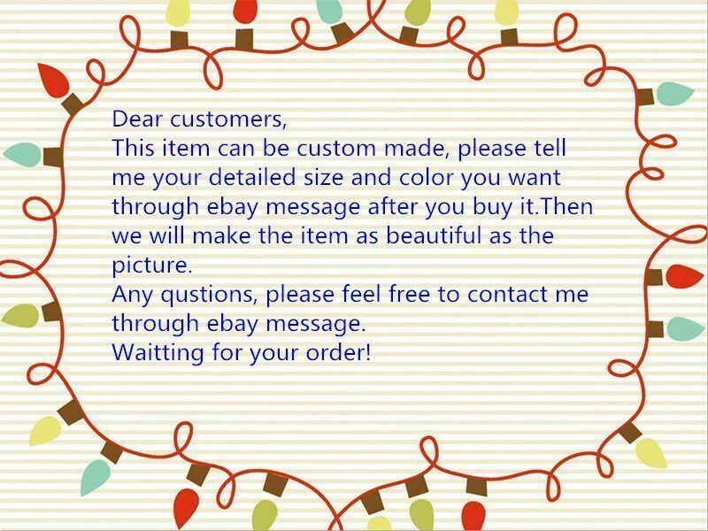Wholesalers and retailers welcome buys our goods. If you buy multiple items, you'll be looking for us in certain cargo We provide the best service for you to make sure you order as quickly as possible to receive known. Condition -- Brand New Color: Picture or custom color If you need very urgent. Please contact us first.We can offer expedited shipping service. SIZE CHARTS MEASURE GUIDE Item Color =____(picture or custom color, custom color refer to our color swatches) 1.Neckline =___CM or inches 2.Shoulder to shoulder =____CM or inches 3.Arm Length = ____CM or inches 4.Armhole= ____CM or inches 5.Cuff = ____CM or inches 6.Chest =____CM or inches 7.Belly=____CM or inches 8.Waist =_____CM or inches (from the top of head to floor without shoes) 9.Hips= _____CM or inches 10.Clothes Length =______ 11.Pants Length= _____ CM or inches 12.Thigh=_______CM or inches 13.Height=_______CM or inches 14.Your Contact Telephone Number:(it is necessary) _____ 15.You need suits at the latest delivery date ____ NOTE The item does not include any accessories. Bidding is for one only!!! We create item according to the picture, so we don't guarantee the creation and picture completely same. Since computer screens have chromatic aberration, especially between CRT screen and LCD screen, we can not guarantee that the color of our products will be exactly the same with the photographs you saw. Before ordering, please read this listing carefully and ask all your questions. To send an email, please click on the link, Ask seller a question at the top right hand corner of this listing. We will answer your questions within 24-48 hours. If you do not receive a reply We accept PayPal only. This is a safe and the fastest way to arrange the payment. You can pay by any Credit Card. Register is very easy and fast - Paypal NOTE: We accept paypal payment only. All items you purchase from us are insured by PAY PAL Buyer Protection Program. If you don't have paypal account, it doesn't matter. You can also pay via paypal with you credit card or bank debit card. Payment can be submitted in any currency. As it is international shipping service,delivery time and postage vary from different region. If there is any questions, please feel free to contact us. Shipping Provider Destination Delivery Time Online Tracking DHL Canada 5-6 Business days YES Equick , RPX UK?GE 7-10 Business days YES ARAMEX, Equick AU 7-10 Business days YES USPS, DHL US 5-8 Business days YES UPS, TNT, EMS, Fedex Other Countries ( worldwide ) different country different time YES Please Note: Import duties,taxes and charges are not included in the item price or shipping charges. These charges are the buyers' responsibility.Please check with your country's customs office to determine what these additional costs will be before bidding/purchasing. Returns and Exchanges: If you don't like what you ordered or something isn't right. We accept returns and exchanges. We only accept returns of unwashed, unworn or defective merchandise if something isn't right. Return shipping fee is to be paid by buyer ( the refund will be minus shipping fees ).Please inform us within 14 days of receipt. Detailed Seller Ratings: Feedback: If plan to give us a neutral/negative feedback, please write to us immediately so that we can do our best to resolve your problem. Shipping charge: some buyers might think our shipping charge is high. But the fact is NOT, we charge you basing on the actual shipping cost. if you?re satisfied with our product and our total service, your recognition is our motivation in developing our business to serve you even better. Shipping time: because you bought the item from opposite side of the earth, it needs time to ship and the duration on its way to you is out of control. What under our control is that we will ensure ship the item within certain biz days as described in item listing. When you receive it, we sincerely hope that you will like it and appreciate our customer services. If you have anything you feel unsatisfied with, please do tell us. So we can know what we should do to help you. In the meantime, we will get to know where we should improve. If you are satisfied, we sincerely hope that you can leave us a positive comment and four 5-star Detailed Seller Ratings, which are of vital importance to the growth of our small company. Besides, PLEASE DO NOT leaves us 1, 2, 3 or 4-star Detailed Seller Ratings because they are equal to negative feedback. Like what we said before, if you are not satisfied in any regard, please tell us. Other terms: Place a bid only if you are a serious buyer. Email to us if you have any questions before bidding. Payment is expect to be paid within 3 days after auction ends. I do follow eBay's Non Paying Bidder Programme. If you are not happy with your purchase then please contact me immediately ... you should always contact the seller before you leave neutral or negative feedback!! If you are interested in our product want to understand any more information, you can contact me directly or use the contact link at the top of the page to send me a message via eBay!