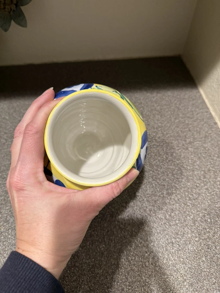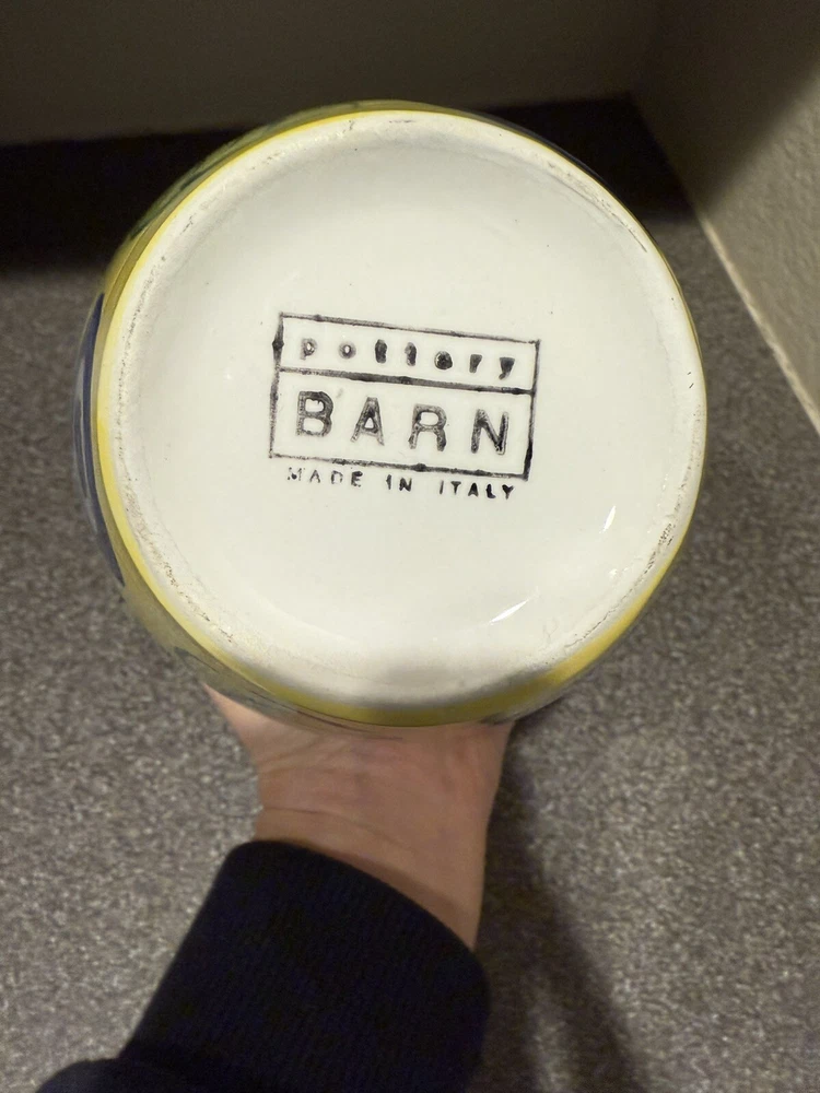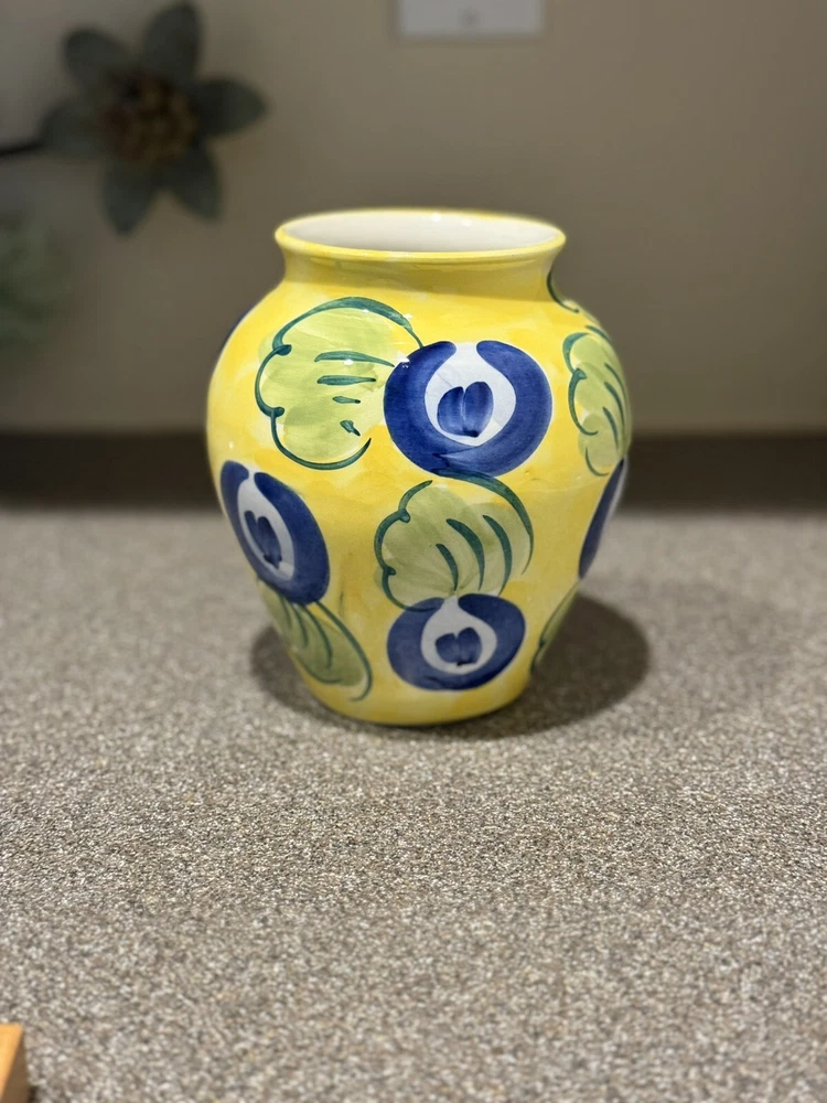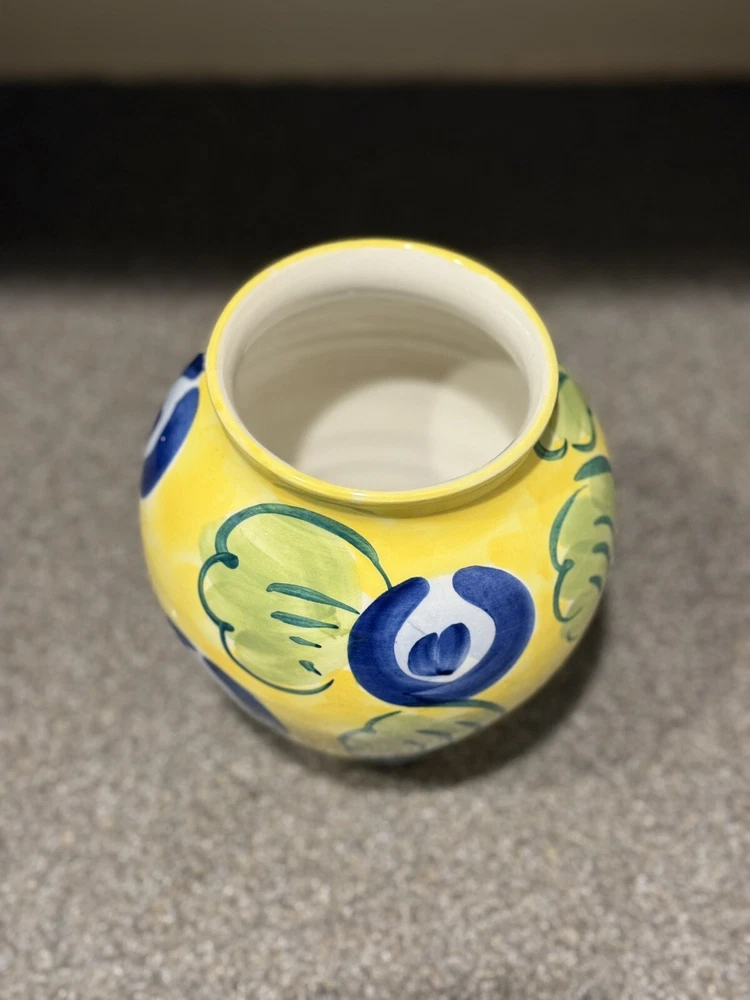 The product is a Yellow Pottery Barn Italian Vase made of ceramic, standing at 6 inches in height. It features a flower theme and is designed to hold flowers for decorative purposes. The vase is a stylish home décor piece that can add a pop of color to any room, especially for those who appreciate the Italian design aesthetic.