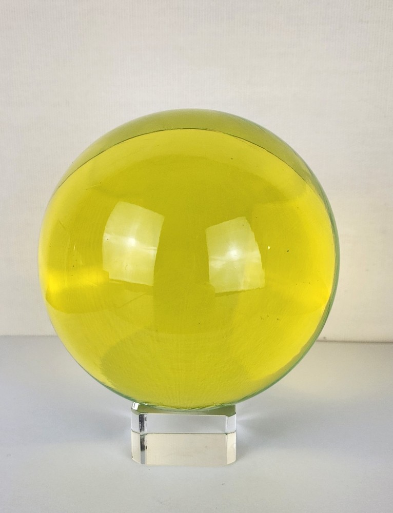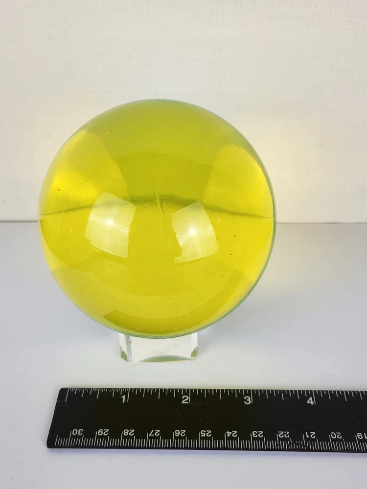Add a little glow and personality to your desk or shelf with this 3.93" / 100mm Yellow Vaseline Uranium Glass crystal ball paperweight. The solid glass orb is completely round and will not sit on it's own. The base shown is not included. Under blacklight, it shines with a captivating green glow, bringing a fun and unique touch to any room. This piece pairs wonderfully with rustic, cabin, farmhouse, dark, witchy and cottagecore aesthetics — or just anyone who loves cool, glowing decor. Blacklight photo taken with 395nm blacklight but it will glow under any blacklight (395nm / 365nm). *Excellent condition! There are a few very tiny bubbles inside the glass. ***CAUTION - DO NOT ALLOW THIS TO BE STILL IN THE SUNLIGHT FOR LONG PERIODS OF TIME! Crystal balls can cause fires when in direct sunlight from light refraction. We recommend displaying indoors away from windows. *5