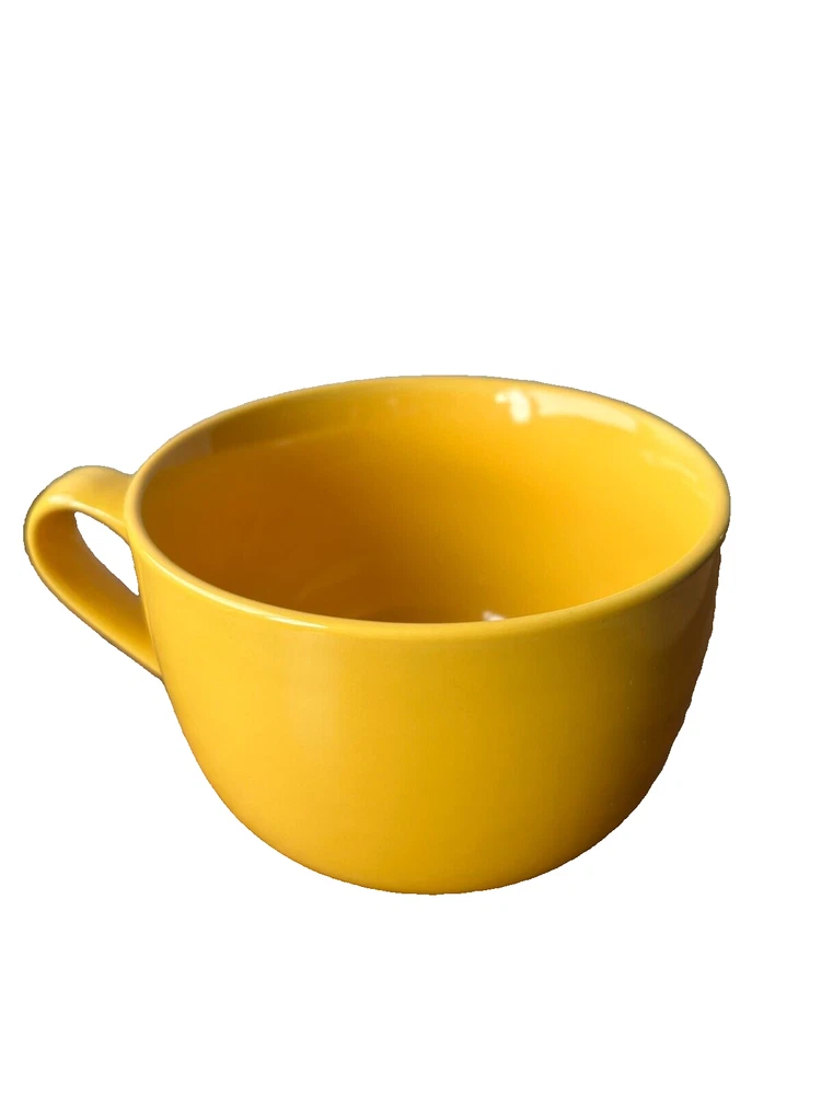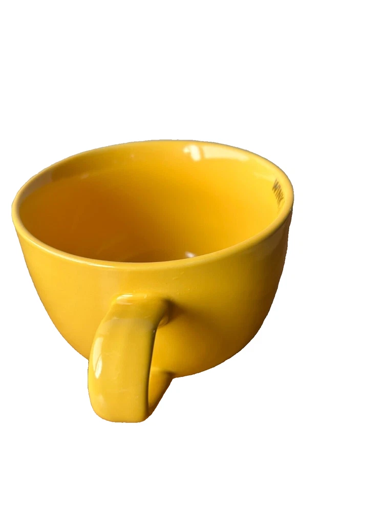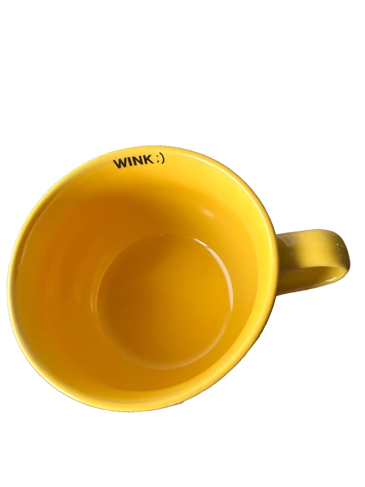 Bright yellow ceramic mug with a charming winking face design, perfect for coffee, tea or soup. Measuring 5.5 inches in diameter and 4 inches in height, this pre - owned mug is in very good condition with no chips or cracks. A spacious and playful addition to your kitchen or a thoughtful gift!