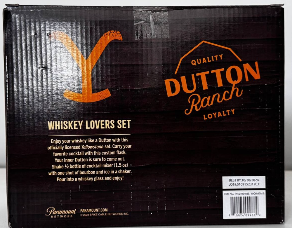 Personalize: No Theme: Food & Drink Glassware Type: Whiskey Glass UPC: 810074099882 Number of Items in Set: Three-Piece Character: yellowstone dutton Brand: Yellowstone Features: Decorated, Etched, With Presentation Box gtin13: 810074099882 Color: Clear Type: Whiskey Lovers Set Set Includes: Whiskey Glass, flask, mixer