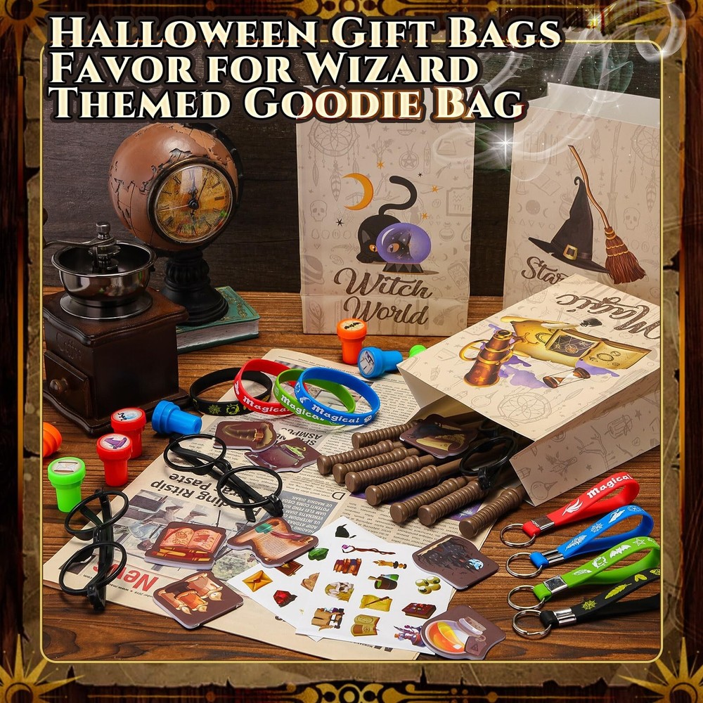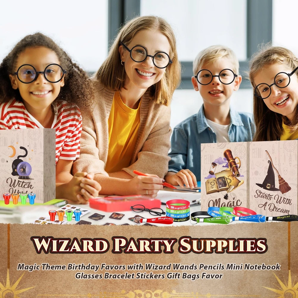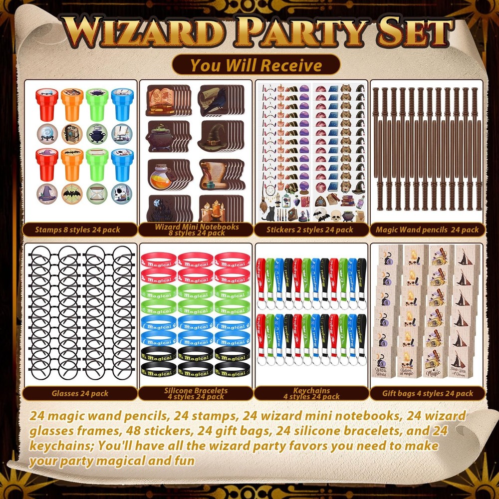Yexiya 216 Pcs Wizard Party Supplies Magic Theme Birthday Favors with Wizard Wands Pencils Mini Notebook Glasses Bracelet Stickers Gift Bags Favor for Goodie Bag Stuffers Classroom Prizes Supplies Product Details Color: [Mixed] Material: Wood, Resin, Paper, Plastic Brand: Yexiya Theme: Wizard Item dimensions L x W x H: 9.84 x 7.87 x 2.36 inches Occasion: Birthday Item Weight: 1.48 Kilograms Manufacturer: Yexiya Age Range (Description): Kid Product Dimensions: 9.84 x 7.87 x 2.36 inches Item Weight: 3.25 pounds Country of Origin: China Item model number: JF-Yexiya-3526 Manufacturer recommended age: 6 years and up Wizard Party Set: our package includes 24 magic wand pencils, 24 stamps, 24 wizard mini notebooks, 24 wizard glasses frames, 48 stickers, 24 gift bags, 24 silicone bracelets, and 24 keychains; You'll have all the wizard party favors you need to make your party magical and fun Quality Material: magic wand pencils are made from wood, wizard mini notebooks, gift bags and stickers from paper, wizard glasses frames from plastic, and the silicone bracelets and keychains are made from resin; Offering reliability for your magical wizard party favor Realistic Design: each item in our wizard party supplies carries a vivid design; From the magic wand pencils to the wizard glasses frames, these supplies take your wizard birthday favors experience to another level, it creates an immersive experience Amazing Gifts: our wizard party supplies set have a big hit with children, ideal as birthday gifts, goodie bags fillers, Halloween gifts, Thanksgiving gifts, also as a great reward for children and adults Wide Application: wizard birthday gifts are suitable for various occasions, such as magic wizard theme parties, inspiration theme parties, Halloween parties, wizard theme birthday parties or any theme parties with magicians and wizards activities, etc Features: Magical Wizard Party Favor: This set includes everything you'll need to create a magical wizard party favor experience. With items like magic wand pencils, stickers, and silicone bracelets, your guests will be immersed in an enchanting world of wizard, making your event memorable. Wizard Birthday Favors: The comprehensive set has items made from quality materials, promising a party experience like no other. You'll create a world for your guests that will linger in their memories long after the celebration ends. Specifications: Material: Magic wand pencils: wood Wizard mini notebooks: paper Wizard glasses frames: plastic Stickers: paper Gift bags: paper Silicone bracelets: resin Keychains: resin Color: as shown in the picture Size: as shown in the picture Package includes: 24 x Magic wand pencils 24 x Stamps 24 x Wizard mini notebooks 24 x Wizard glasses frames 24 x Stickers 24 x Gift bags 24 x Silicone bracelets 24 x Keychains Notes: Manual measurement, please allow slight errors on size. The color may exist a slight difference due to different screen displays.