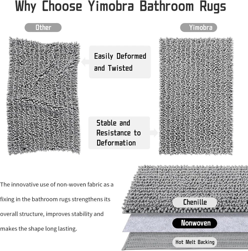 Yimobra Bathroom Rug Mat 24 x 17, Extra Soft Non Slip 24" x 17", Grey Product Details Brand: Yimobra Size: 24" x 17" Material: Chenille Weave Type: Machine Made Item Weight: 1.2 Pounds Pile Height: High Pile Construction Type: Machine Made Back Material Type: Hot Melt Adhesive Color: Grey Indoor/Outdoor Usage: Outdoor, Indoor Theme: Modern Is Stain Resistant: Yes Product Care Instructions: Machine Wash Pattern: Solid Shape: Rectangular Special Feature: Absorbent, Quick Dry Room Type: Guest Room Rug Form Type: Bath Mat Style: Modern Occasion: Christmas, Housewarming Number of Pieces: 1 Is Autographed: No Age Range (Description): Adult Product Dimensions: 24 x 17 x 0.01 inches Item Weight: 1.16 pounds Manufacturer: Yimobra Fabric Type: Chenille Assembly required: No Batteries required: No Chenille Soft & Warm: Yimobra luxury chenille bathroom rugs (24 X 17 inch), avoid to jumping out the wet cold tiles after the bath, the thick and soft chenille floor mat makes your feet feel the ultimate luxury enjoyment. Density and ultra plush of pile, it provides excellent comfor for your feet,means that softer and warmer Super Absorbent: No one likes the water on the bathroom floor, These thick fluffy microfiber bathroom rugs are super absorb water quickly with minutes, to leave your bathroom smelling fresh. Yimobra bathroom mat is extremely plush more thick, there is no water with our mat. Thus making the bath mats amazing cozy Easy To Clean & Machine Washable: Yimobra bath rugs features anti slipping adhesive backing and quality thick shag, which has the advantages of staying in place firmly, easy to storage, can be folded, holding up to multiple machine washes and dry. The colors keep vibrant even after many times washes Multi Purpose Use: Yimobra non-slip bath mat rug is suitable for tub-side, front of the sink, and any place in your home where you want to support and relax on your toes! We focus on quality and comfortable about mats for bathroom, and provide several more than 10 kinds of colors and various sizes of bathroom designs, that it matches your bathroom. Great for bathroom, vanity, vacation home, master bathroom, kids bathroom, guest suite How Is The Feeling Of Walking On The Clouds? It's Yimobra Luxury Chenille Bathroom Mats! - Thicker and better constructed chenille bathroom mat, provides comfortable underfoot support is just like walking on the soft clouds. We have prepared many colors schemes for you, choosing the one of your favorite colors to match the home decoration perfectly. Tips: Due to the lighting and monitor settings, the color of pictures will be vary