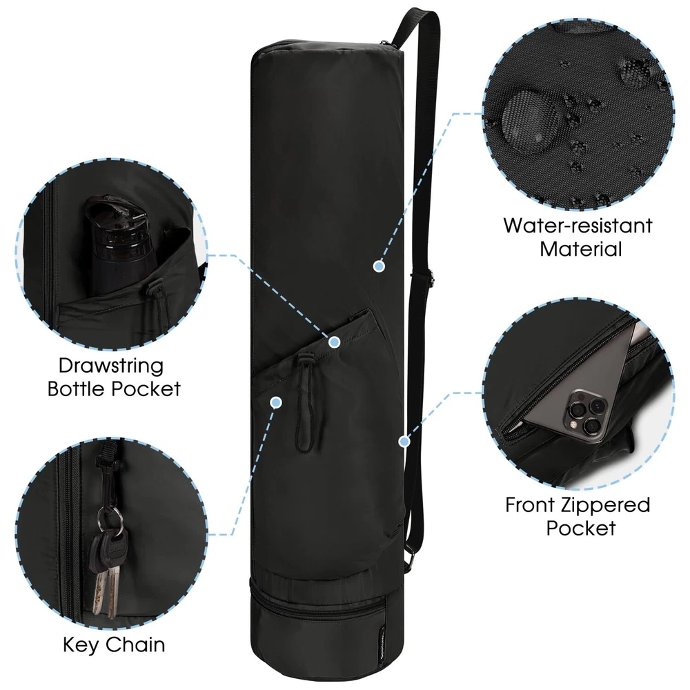 【Perfect Size】 Our New Yoga Mat Bag full dimensions: 31"L x 7.5" Diameter,which can hold yoga mat size up to 69"L x 23"W x 2/5"(10mm)Th (23" wide and 7" in diameter when rolled up). patent pending (YOGA MAT NOT INCLUDED) 【Stylish Wet Pocket Design】1 zip waterproof Bottom Wet Pocket which height 3.2-inch on bottom. It can hold sports towels and sports yoga pants, or other personal essentials like yoga straps, towels, travel-size convenience kit etc (YOGA MAT NOT INCLUDED). 【2 Multifunctional Side Pockets】Exterior features 1 front drawstring roomy pocket for water bottles, umbrella, rope skipping or other sports accessories. 1 exterior side zip small pocket (length 7.8-inch) for quick storage of your , keys, wallet, IDs, essentials, keeps your valuables close & secure (YOGA MAT NOT INCLUDED). 【Easy to Carry】 Widened shoulder straps & Easy adjustable shoulder strap(max length 47-inch) design is suitable for different heights of women and men. It can be carried across your body or over-the-shoulder. Free your hand and be more convenient (YOGA MAT NOT INCLUDED). 【Quick Access】The quick-open drawstring make you grab your mat in a flash whether you’re carrying your mat & essentials to class, or a yoga training trip (YOGA MAT NOT INCLUDED).