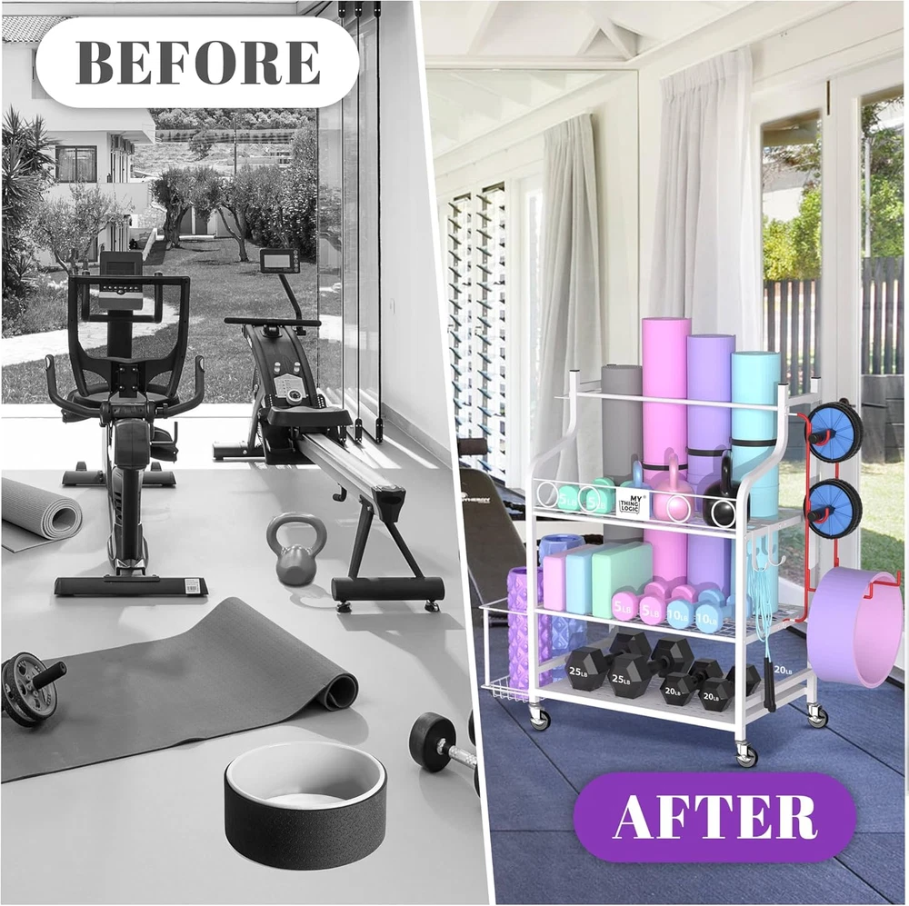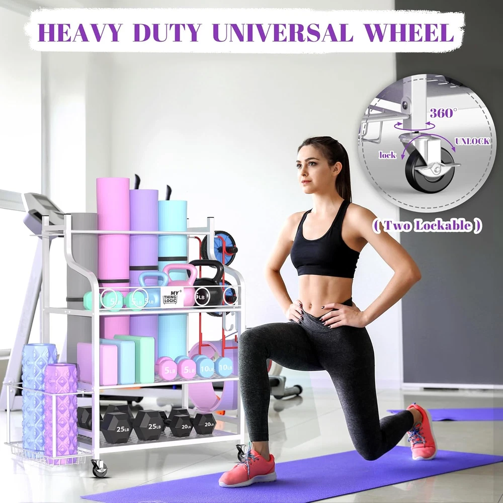 Store New Arrivals Add to Favorite View Feedback Contact Yoga Mat Storage Racks,Home Gym Storage Rack for Dumbbells Kettlebells Foam Roller, Yoga Strap and Resistance Bands, Workout Equipment Storage Organizer with Hooks and Wheels Description Part Number M721W Style Hanging Item Dimensions LxWxH 15.71 x 40.39 x 34.29 inches Color White Product Dimensions 15.7"D x 30.5"W x 34.3"H Material Alloy Steel Package Weight 9.08 Kilograms Weight Limit 35 Kilograms Item Weight 5 Pounds Number of Racks 3 Frame Type Rectangular Frame Item Package Dimensions L x W x H 35.28 x 16.22 x 4.25 inches Included Components Casters STORAGE VARIOUS ITEMS: This workout storage organizer can help to store your yoga mat, dumbbells, kettlebells, yoga brick, resistance band,roller wheel, foam roller etc.. Perfect for fan of yoga. WELL-MADE QUALITY STORAGE RACK: The yoga mat rack is made with high quality powder coated finish steel, the whole construction is sturdy and durable which can be use for years. And it is suitable for many occasions, such as gym, personal home gym, fitness club and garage. HEAVY DUTY CASTERS: The home gym storage rack comes with 4 strong 360-degree wheels (2 lockable) and can easy to move indoor and outdoor as well as any places you want to use. LARGE CAPACITY STORAGE ORGANIZER: The storage rack is quipped with 3 layers of metal mesh, a side basket, 3-sectional iron holder and several hanging hooks which can store for various yoga gear and exercise equipment. EASY TO ASSEMBLE: The dimension of this gym organizer is 40.4 inch(L) x 15.7 inch(W) x 34.3 inch(H). With the help of instruction, you can easy install the whole unit. Product Description OTHER HOME GYM STORAGE RACK FROM MYTHINGLOGIC Add to Cart Add to Cart Add to Cart Add to Cart Large weight rack Customer Reviews 4.7 out of 5 stars 1,497 4.7 out of 5 stars 1,497 4.7 out of 5 stars 182 4.7 out of 5 stars 182 — Price $89.99 $ 89 . 99 $84.99 $ 84 . 99 $109.99 $ 109 . 99 $169.99 $ 169 . 99 — Material Metal Metal Metal Metal Metal Surface Powder coated Powder coated Powder coated Powder coated Powder coated Dimension 30.5"x 15.7"x 34.3" 30.5"x 15.7"x 34.3" 34.3''x12.2''x37'' 51.4‘’x 15.7‘’x 36.6‘’ 30.5” x 15.7”x 62.2” Wheels ✔ ✔ ✔ ✔ ✔ Assemble required ✔ ✔ ✔ ✔ ✔