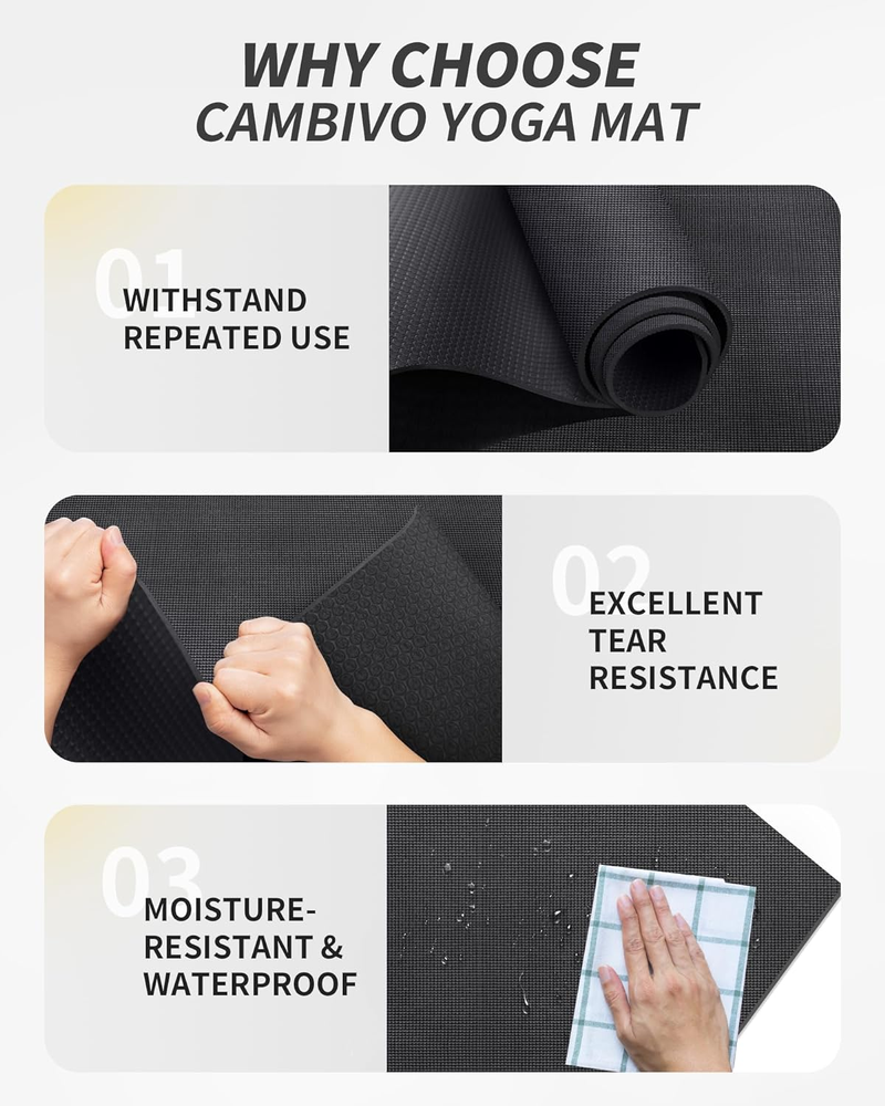 NEW Yoga Mat for Women and Men, Extra Long and Wide Exercise Mat(72"X48"/84"X30"), Large Non Slip Workout Mat for Yoga, Pilates, Fitness, Barefoot Workouts, Home Gym Studio FEATURES SPECIFICALLY DESIGNED FOR TALL YOGIS - At 84 x 30 inches length and width, you will never feel restricted or limited by the size of this exercise mat. The Cambivo yoga mat was created for taller men and women, and everyone who requires longer and wider exercise space, by providing them with more room to stretch and practice. Add Cambivo extra long exercise mat to your fitness routine for a better workout experience OUTSTANDING CUSHIONING AND RESILIENCE - The Cambivo 6mm thick yoga mat provides outstanding cushioning and resilience for yogis with an excellent stability in any Asana. The thick gym mat takes the pressure off the joints to protect the yoga beginners and practitioner from injury. No more sore knees and elbows, good shock absorber for activities ULTRA COMFORT FOR A BETTER WORK OUT - The Yoga Mat is designed to give you the most comfortable yoga experience possible. The great thickness of the exercise mat allows you to do any Yoga Poses, Yin Yoga, Pilates, Stretch, Foam Rolling, Meditations and various barefoot bodyweight trainings like Squats, Lunges, Push ups and Plank UNIQUE HONEYCOMB BOTTOM DESIGN - The reverse protruding texture grips and prevents the mat from sliding around and offers stability on hard or soft surfaces. Your feet can easily grounded and secured on the mat when you go through the practice. Treat yourself to a unrestricted exercise experience on a reliable mat. EASY STORAGE AND TRAVEL FRIENDLY - Cambivo extra long yoga mat is home gym add-on and it is easy to carry to gym or yoga class. The mat can be rolled up nicely for easy transport. After each exercise, gently wipe the sweat off the surface of the mat using a mild soap damp cloth and no need to worry about it clinging Product description Unrestricted Comfort Workout Experience 84" x 30" Extra Long and Wide Exercise Mat for Home Gym At 84 x 30 inches in length and width, this mat was created for taller yogis and everyone who needs a longer, wider exercise space. Constructed with non-tear technology, this durable mat will not rip, shred or stretch with regular practice. Non-Slippery Surface and Anti-Tear Design for Better Grip, Withstand Daily Use 6mm Thickness for Comfortable Cushioning OUTSTANDING CUSHIONING AND RESILIENCE The mat comfortably cushions your spine, hips, knees and perfectly reduces pressure on your joints, fully protecting your knees and elbows. The great 6mm thickness allows you to do any yoga pose and a variety of barefoot bodyweight exercises. Durable for Floor Exercises and Home Workouts ADDITIONAL ANTI-SHEAR MESH This large workout mat adds a layer of reticular fibers in the middle, which makes our exercise mat more compliant and durable, different from regular yoga mats 84"x30" Extra Wide and Large Yoga Mat Provides Ample Space for Body Stretches The 84 x 30 inches of Cambivo long yoga mat allows individuals of all ages and fitness levels to enjoy the fun of workout. Witness the change in you with every drop of sweat. Unleash your yoga talent on the CAMBIVO large workout mat ! Lightweight and Portable for Individual or Family Carry Around, Travel, Outdoor Warm Tips: To maintain the mat's longevity and performance, we kindly suggest that you avoid prolonged direct sunlight exposure , especially during hot summer months. What makes CAMBIVO extra long and wide yoga mat stand out from others? A 84" long and 30" wide mat, 45% more space than a traditional standard size mat. It allows those between 6' and 7' tall to plank or stretch with whole body. Super soft and comfy yet very durable and strong mat for any yogis. Does the exercise mat smell strong? It may have a slight smell when you first receive it, the smell is not off-gassing chemicals and will fade over time. You can roll it out and place it in a cool and ventilated place for 2-5 days before your first usage. Why do you need to choose a fitness mat? If you do exercises regularly such as yoga, abdominal exercises or training with weights, it's better to opt for the CAMBIVO gym mat. The non-slip pilates mat with outstanding cushioning ensures you have the best workout experience. More From Us Add to Cart Customer Reviews 4.6 out of 5 stars 3,164 4.6 out of 5 stars 3,164 4.4 out of 5 stars 4,596 4.5 out of 5 stars 2,899 4.5 out of 5 stars 2,089 4.5 out of 5 stars 2,899 4.5 out of 5 stars 1,017 Price $39.99 $ 39 . 99 $64.99 $ 64 . 99 $59.95 $ 59 . 95 $38.94 $ 38 . 94 $25.99 $ 25 . 99 $44.99 $ 44 . 99 $79.99 $ 79 . 99 Material Type PVC PVC TPE TPE TPE TPE High-Density PVC Item Dimensions 84"L x 30"W 72"L x 48"W 72"L x 48"W 72"L x 32"W 72"L x 24"W 84"L x 32"W 72"L x 48"W Thickness 6mm 8mm 6mm/8mm 6mm/8mm 6mm/8mm/10mm 6mm 7mm Double Sided Anti-slip ✔ ✔ ✔ ✔ ✔ ✔ ✔ Accessories Carrying Strap Carrying Strap Storage Strap, Towel, Bag Carrying Strap Carrying Strap Carrying Strap Storage Strap, Towel, Bag Application Especially for Tall Yogis Home Exercise and Gym Home Gym and Yoga Practice All Kinds of Yoga and Exercise Yoga and Pilates Beginners Yoga and Body Stretch Home Gym and Intense Exercise Support Barefoot Barefoot Barefoot Barefoot Barefoot Barefoot Barefoot and Shoes Part Number AC72 Item Dimensions LxWxH 84 x 30 x 0.24 inches Color Black Item Weight 4.9 Pounds Material All-purpose Barefoot Exercise Mat Package Weight 2.38 Kilograms Sport Type Exercise & Fitness & Pilates, Yoga Product Care Instructions Hand Wash Only Product Dimensions 84"L x 30"W x 0.24"Th Item Package Dimensions L x W x H 30 x 5.5 x 5.1 inches Size 84" x 30" x 6mm 30.0 "th x 84.0 "th x 0.24 "th. Weight: 2.38 kg PAYMENT We accept all payments via Ebay using Credit Cards , PAYPAL , Apple Pay and many others SHIPPING Free Worldwide Shipping! ?? We're thrilled to offer most of our products across the globe, all with FREE shipping. However, to make this magic happen, your ord