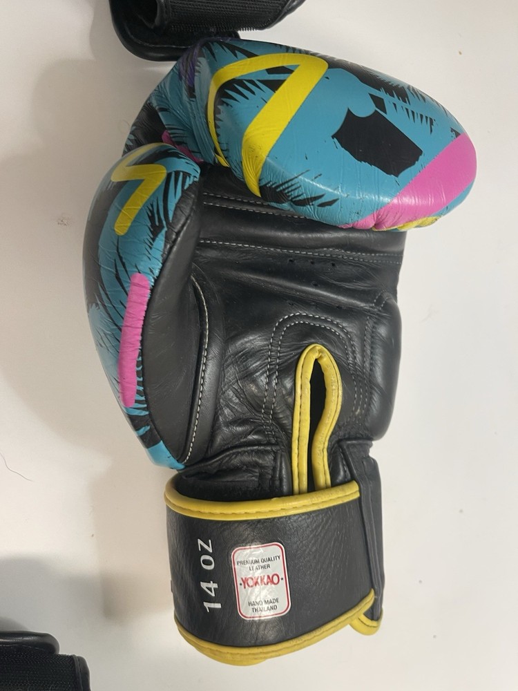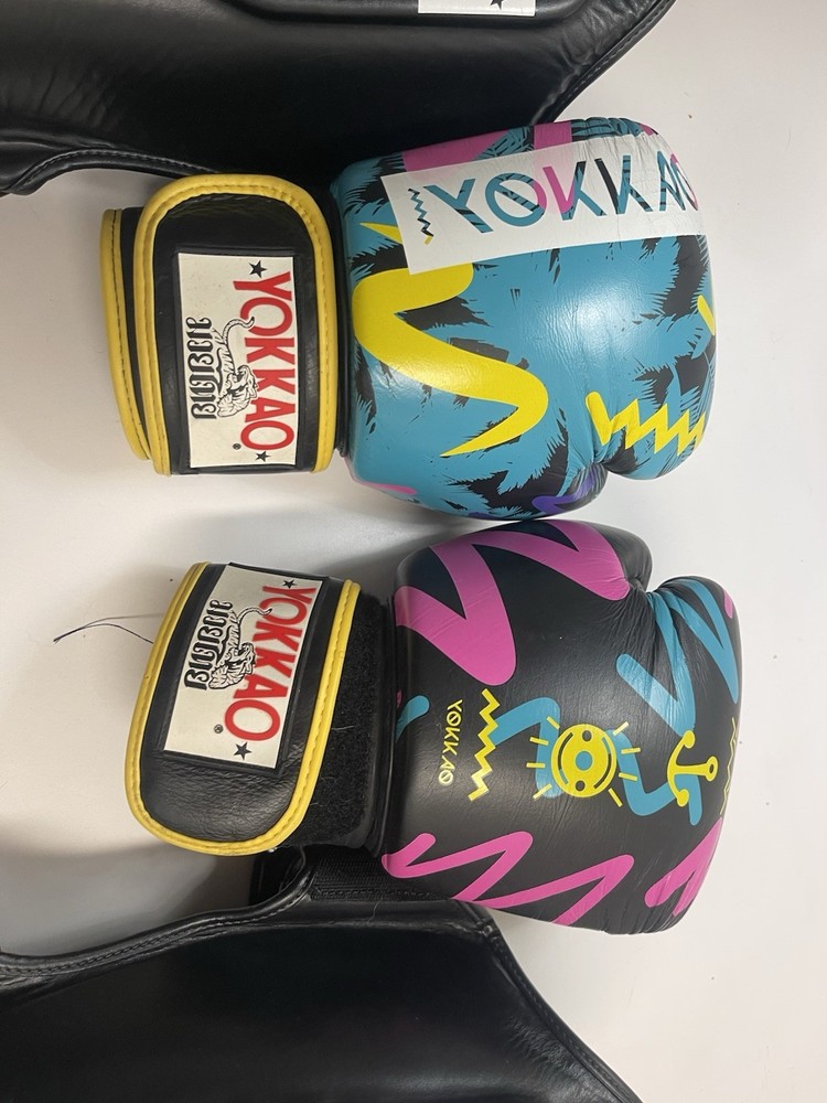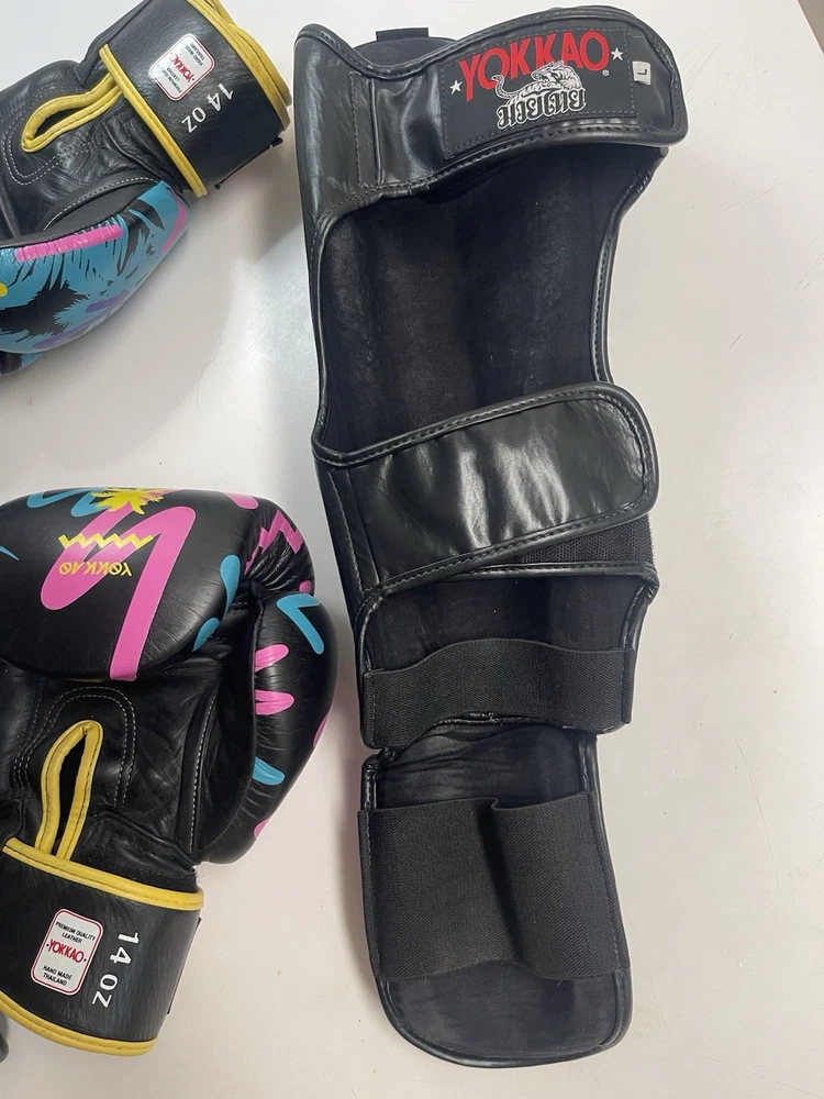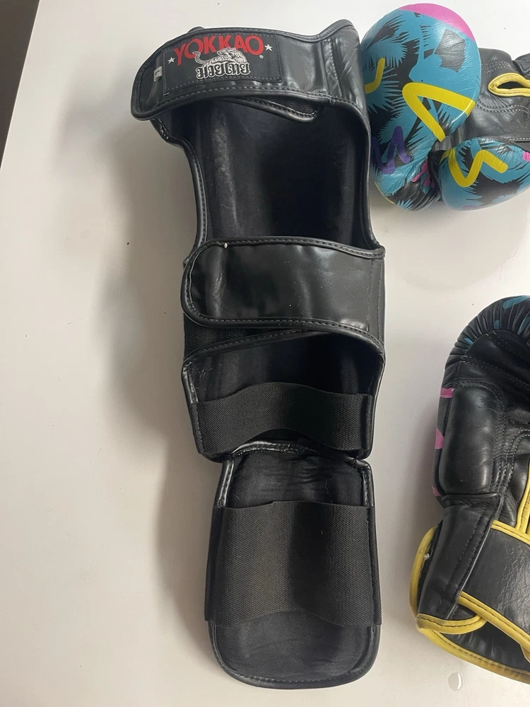 Yokkao Muay Thai Gloves And Shin Guards. The shin guards are barely used. Essentially almost new. I can’t think how many times they were even actually worn but have been in a temperature controlled environment for awhile and are in excellent to like new condition and that is if I am being extremely critical with a very high standard. Even with that I would grade them a 9.5/10 The gloves are a super cool design that I absolutely love. They are 14 oz and unlike the shiny guards have absolutely been used. With that being said the leather is still in fantastic shape with absolutely no cracking and a little bit of creasing and they look and smell good! I would grade these a 6/10 maybe a 7/10 and that is if I am being very harsh on the rating. The Velcro could be better but it holds well enough however not perfect. They look great and do not feel stiff they feel loose in a good way. Let me know if there are any other questions you may have. Thank you for looking and have a phenomenal day. I ship quickly