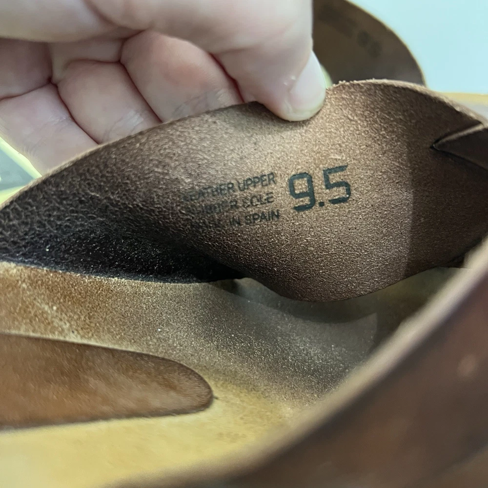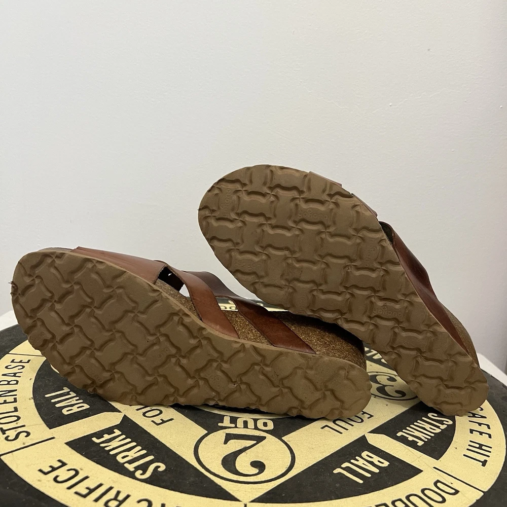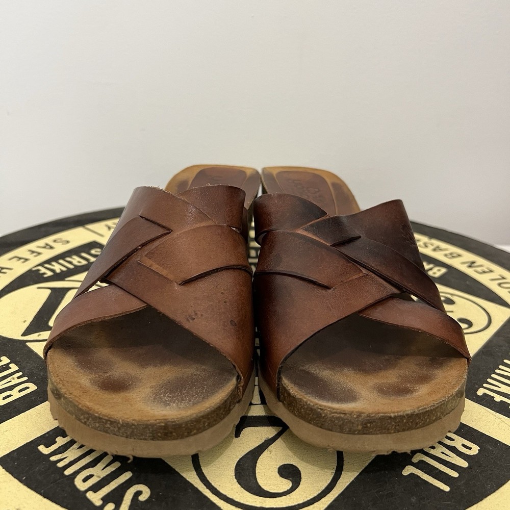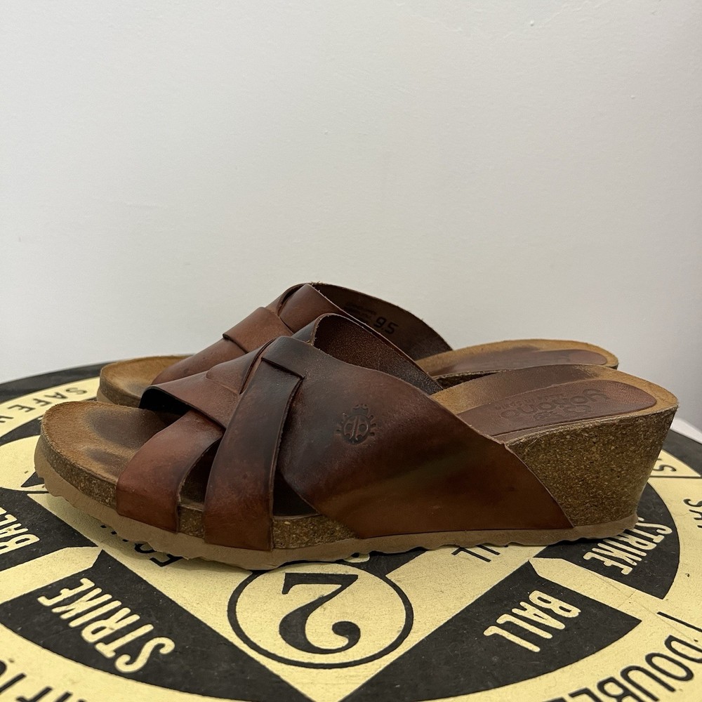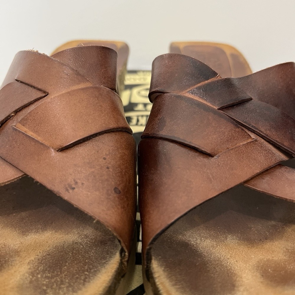 Yukono brown leather woven wedge slip on sandals. Has some staining. Soles have light even wear. Women’s size 9.5