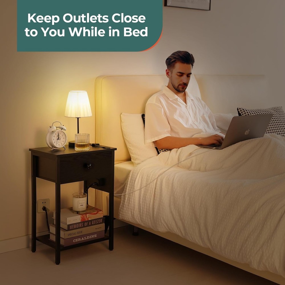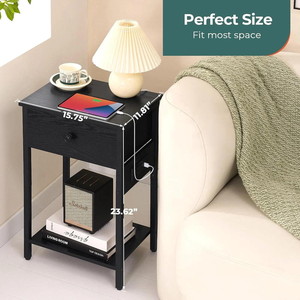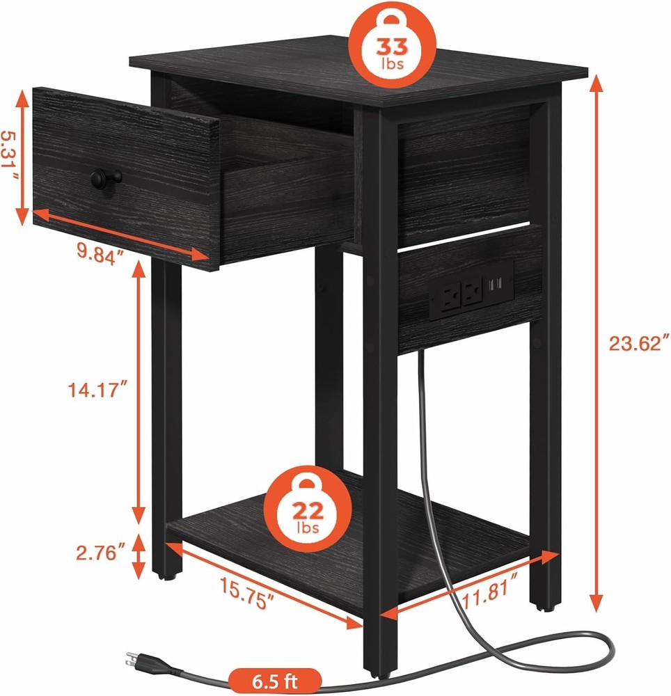 Yoobure Nightstand With Charging Station, Bedside Table Large Black Product Details Brand: Yoobure Product Dimensions: 11.81"D x 15.75"W x 23.62"H Maximum Weight Recommendation: 33 Pounds Color: Black Product Care Instructions: Store in a dry and ventilated place, away from direct sunlight Item WeightFrame Material: 7.67 KilogramsMetal Top Material TypeShape: Engineered WoodRectangular Charging Is Super Easy: Low battery, where is the power outlet? Don't worry, it's within arm's reach. With 2 AC outlets, 2 USB ports and a 6.56 ft. power cord. Yoobure nightstands can meet the charging needs of multiple people and devices. Imagine plugging in your phone and watch before you go to sleep and waking up happily to greet the morning with fully charged devices. Style & Versatile Design: Blending of the traditional, modern and vintage styles, Yoobure side tables living room with a simple structure could fit perfectly into your home's decor. You can place the bedside table in your bedroom, living room or other small spaces, and put some items in the drawer of the side tables bedroom, as well as dress up your room with lamps or radio on the open storage shelves to add a wonderful touch in your home. Dimension & Sturdy: Dimension: 15.75 "L x 11.8" W x 23.62 "H. Strong P2 particle board, high quality metal frame, all these work excellently to give Yoobure night stands for bedrooms strong and stable support. In addition, 4 adjustable feet ensure the balance of the small side table even on uneven floors. (Max load 33 lbs for table-top, 22 lbs for each shelf. Assembly is a Breeze & Clean: No more tedious assembly. No more complicated steps. The package includes instructions, numbered parts, and tools to make assembling the small end table easier and faster. You can also get help assembling the small tables for small spaces by watching the assembly video on the product page. Besides, you don't need to worry about cleaning Yoobure small nightstand, just use a wet towel. Perfect Gifts: We offer 100% support for our end table with charging station. Feel free to contact us with any questions about the night stand with charging station, and we will reply you within 12 hours. Meanwhile, Yoobure stylish and practical nightstand with drawer are meaningful gifts for loved ones, parents and friends to leave your care and love in the bedroom and living room.