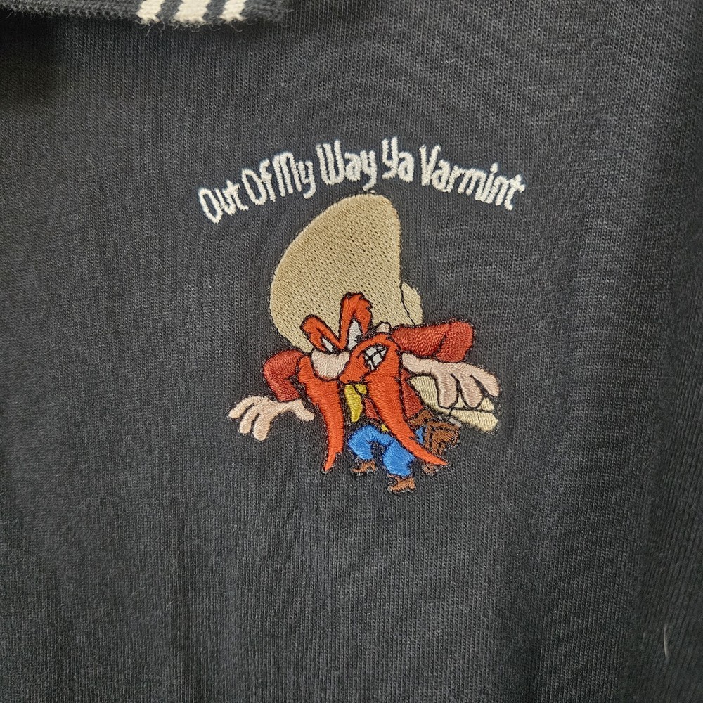 Yosemite Sam Warner Bros Black Embroidered Short Sleeve Polo Unisex Large "Get out of my way ya varmint" Embroidered on chest Good Pre-owned Condition