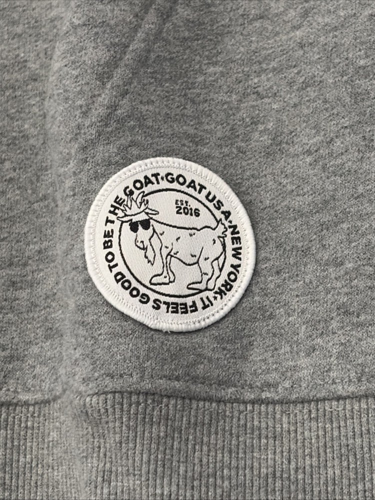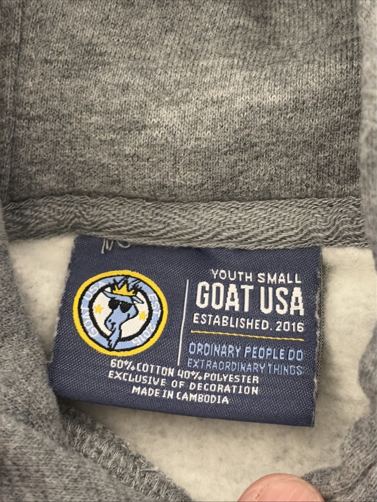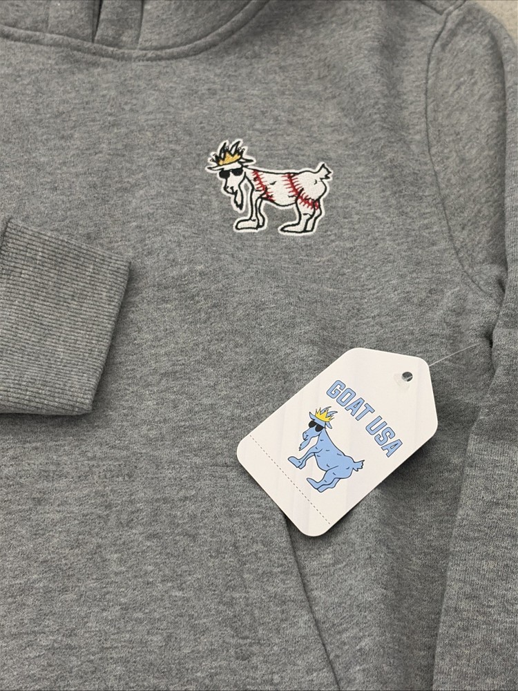 The Youth Goat USA Baseball Hoodie Sweatshirt in size Small is a stylish and comfortable pullover hoodie perfect for casual occasions. Made from jersey fabric in a classic gray color with a logo accent, this hoodie features long sleeves, a hood, and is machine washable for easy care. The hoodie is designed with a regular fit and is ideal for boys who love baseball, making it a perfect addition to their winter and spring wardrobe.
