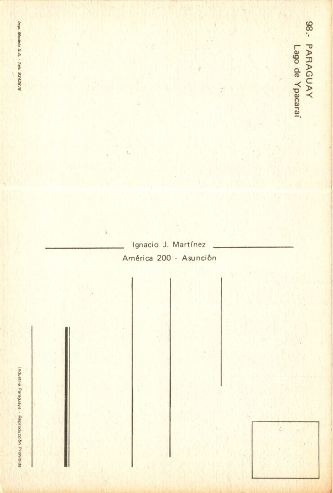 MAKE AN OFFER. THE MORE YOU BUY THE BETTER DEAL I WILL ACCEPT The postcard features a romantic scene set by the blue lake of Ypacaraí in Paraguay. The message describes a warm night when the sender and recipient met. The postcard is from Ignacio J. Martínez, located on América Street in Asunción, Paraguay. The printing company responsible for the postcard is RU Imp. Modelo S.A.
