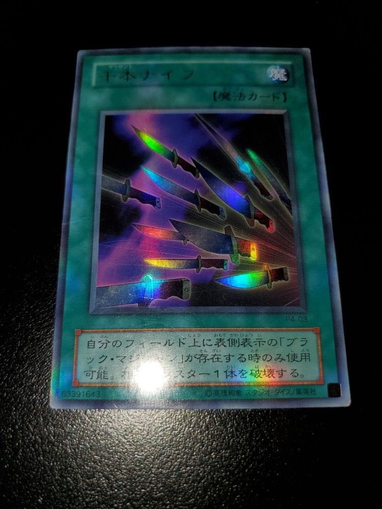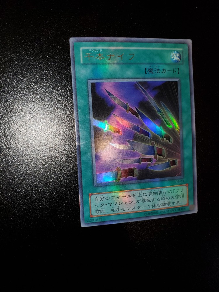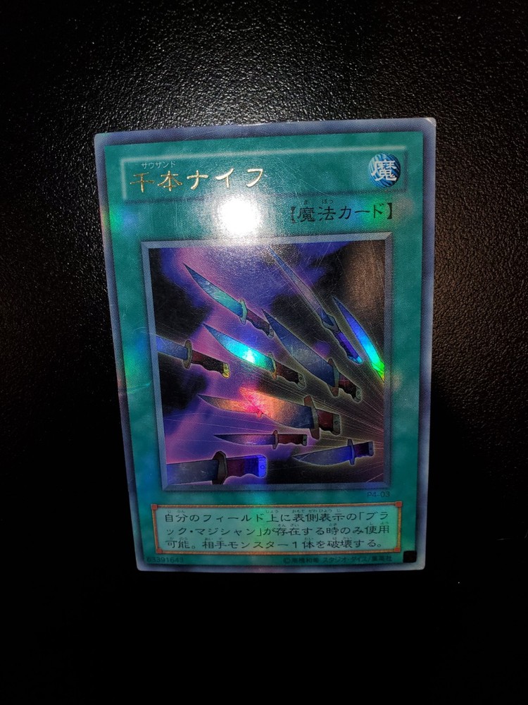Yugioh 2001 Thousand Knives P4-03 Full Holo Bleed 🩸 Japanese OCG Moderate Play Will ship safely & securely through eBay envelope tracking. Penny sleeve inside toploader wrapped in an antiweather and antislip team bag. As a long time seller on eBay, I want every order placed with me to arrive timely and safely. You are entrusting me with your hard earned money and I will not only meet, but surpass your trusted expectations. Feel free to message me for further pictures or questions.
