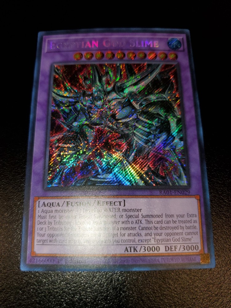 Yugioh Egyptian God Slime 1st Ed. RA01-EN029 Secret Rare Near Mint You will receive one. Picture above is for reference only. Will ship safely & securely. Placed inside toploader wrapped in an antiweather and antislip team bag. As a long term seller on eBay, I want every order placed with me to arrive timely and safely. You are entrusting me with your hard earned money therefore I will not only meet, but surpass your trusted expectations. Feel free to message for further pictures or questions.