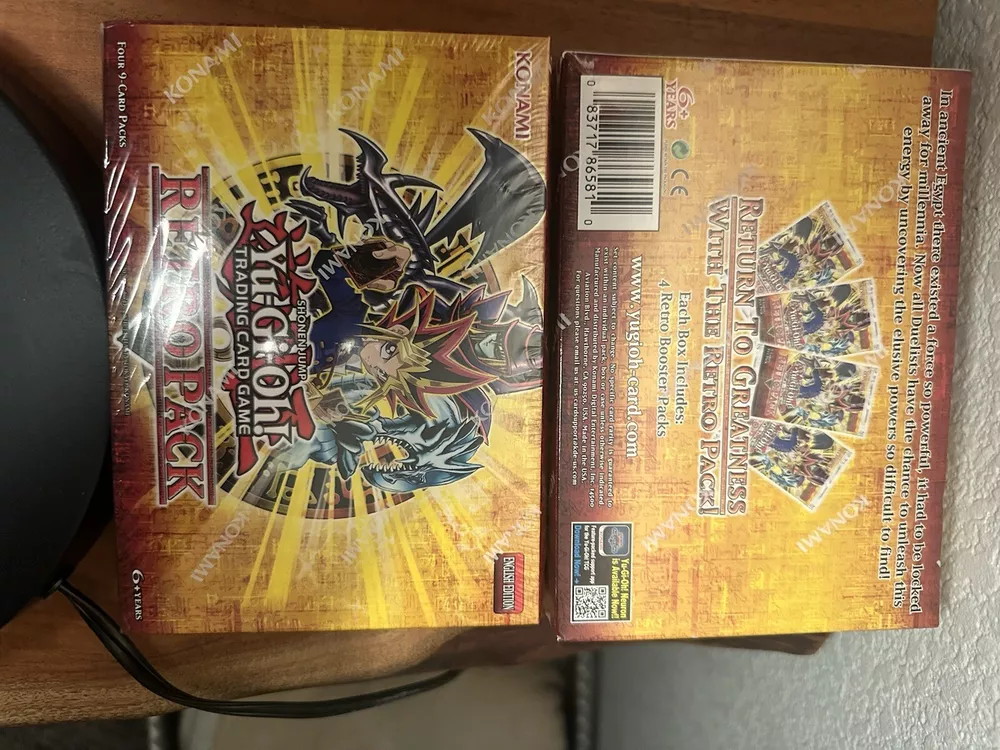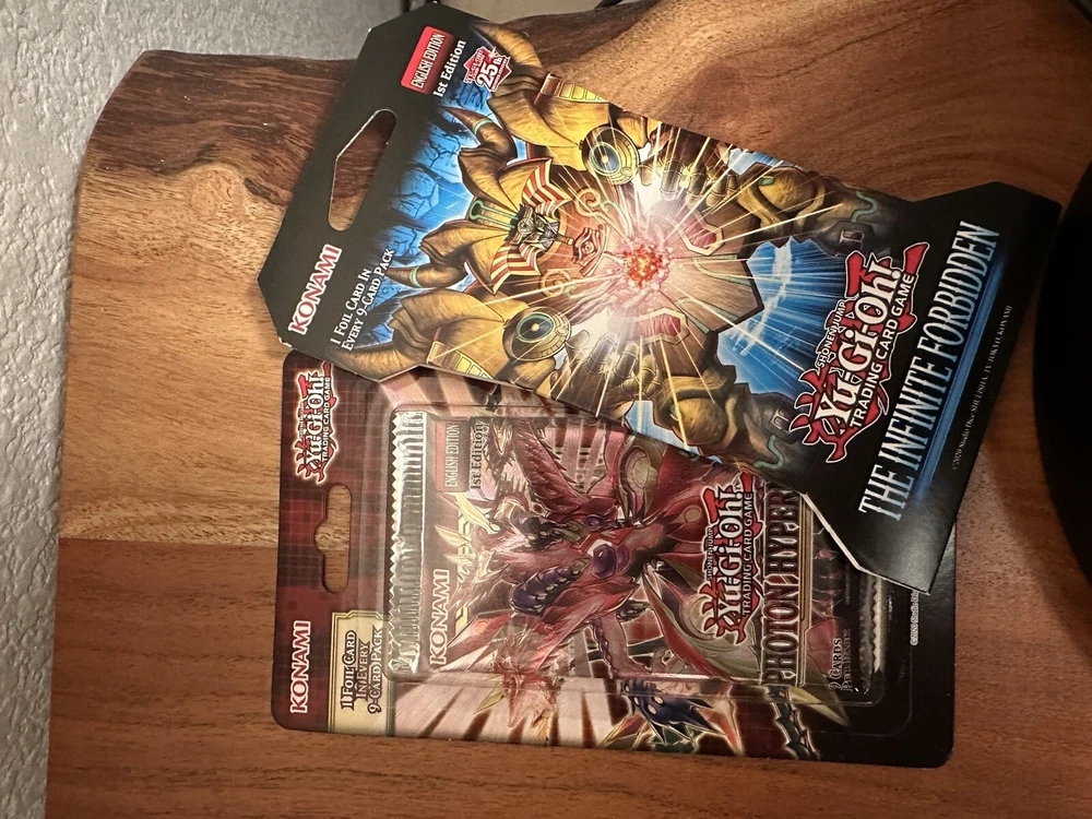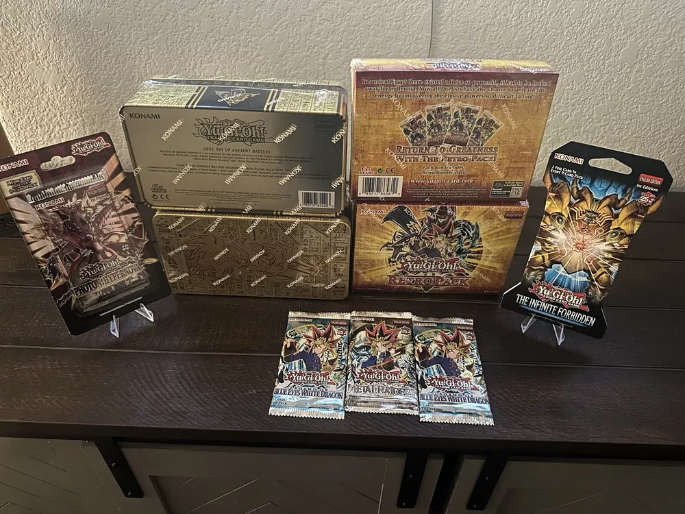 Yu-Gi-Oh Lot Of 9 Sealed Product Includes 2 - Retro pack box includes (4) Retro packs 2 - 2021 ancient Tins Each tin includes 3 Mega Packs 2 - Legend of blue eyes 25th anniversary booster packs 1 - metal raider booster pack 1 - Photon Hypernova 1st edition blister pack 1 - The Infinite Forbiddem 1st edition blister pack Shipped with care