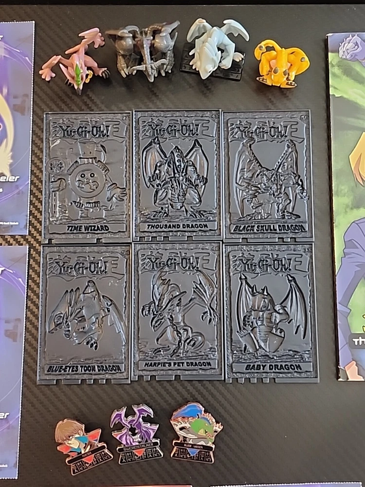 This Yu-Gi-Oh! TCG mixed item lot includes a variety of items such as labeling pins, plastic cards, an official rulebook, and a monster guide. Some of the cards included in this lot feature popular characters such as Harpies Pet Dragon, Baby Dragon, Rude Kaiser, Swordstalker, Blue-eyes Toon Dragon, Black Skull Dragon, Kaiba, Thousand Dragon, Joey Wheeler, and Time Wizard. The lot also includes a deck zone, figurines, and a collectors edition. All items are made of high-quality plastic and are in excellent condition. This set is perfect for any Yu-Gi-Oh! TCG fan or collector, and it is sure to provide hours of entertainment and fun.