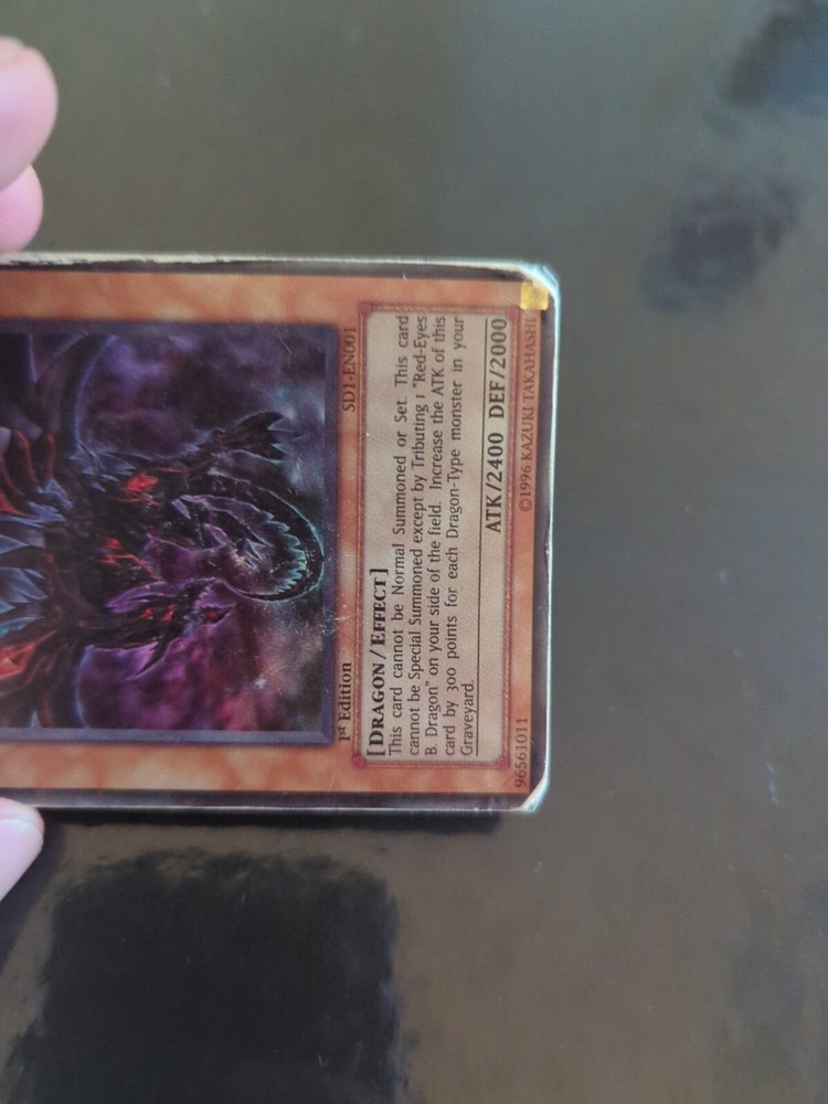 Red-Eyes Darkness Dragon - SD1-EN001 - Ultra Rare - 1st Edition. Card is heavily played. Additional photos can be sent on request. Items will be sent in a sleeve and toploader inside an envelope for protection. I am selling multiple other TCG cards (Pokémon, Yu-Gi-Oh) - please get in touch if you would like any others.