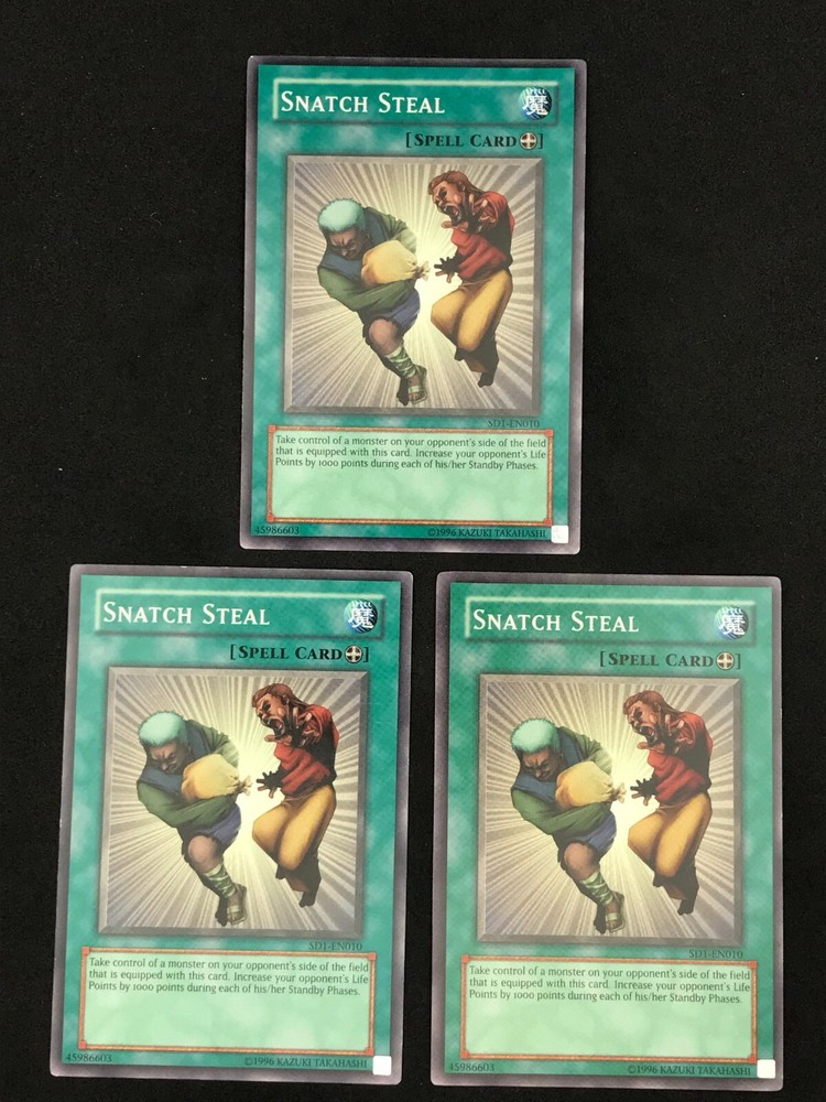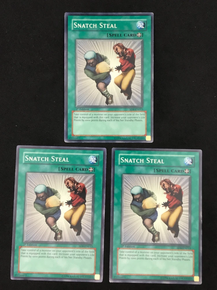 Listing is for a playset of 3x Snatch Steal YuGiOh cards. Th e condition and edition of the playset is specified in the drop down list. The pictures associated with the selection in the drop down list are of the actual cards you will receive. Condition of the card is as pictured. Card will ship in a plain white envelope via Ebay Standard Envelope service. Additional cards ship free when purchased at the same time using the cart feature. The cards must be purchased at the same time and not individually for the shipping discount to be automatically applied. Shipping by Bubble Mailer using USPS Ground Advantage is also available under shipping options for an additional charge. International Buyers - I use the eBay International Shipping Program for international shipments. The international portion of the shipment is handled by eBay and the shipping price is set by eBay. I have no control over the shipping price they set.