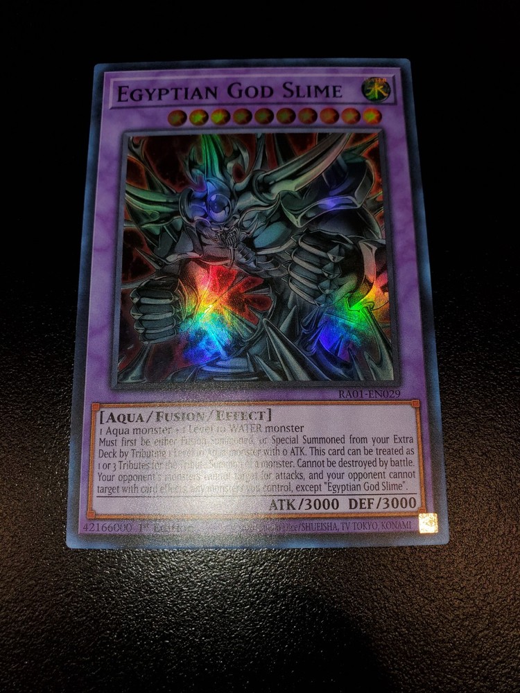 Yugioh Egyptian God Slime 1st Ed. RA01-EN029 Super Rare Near Mint You will receive one. Picture above is for reference only. Will ship safely & securely. Placed inside toploader wrapped in an antiweather and antislip team bag. As a long term seller on eBay, I want every order placed with me to arrive timely and safely. You are entrusting me with your hard earned money therefore I will not only meet, but surpass your trusted expectations. Feel free to message for further pictures or questions.