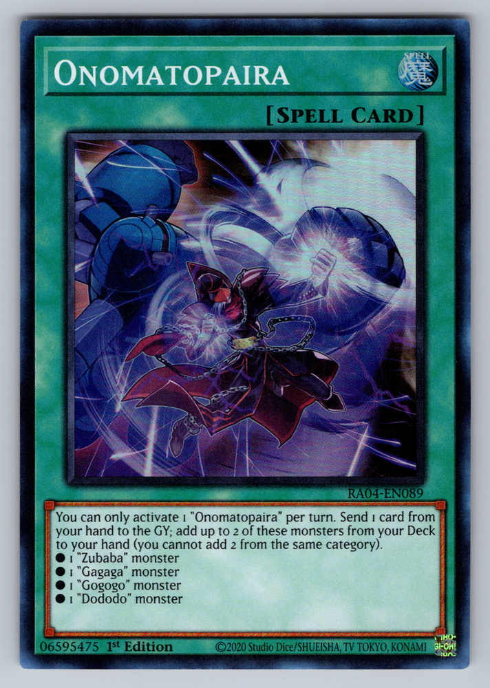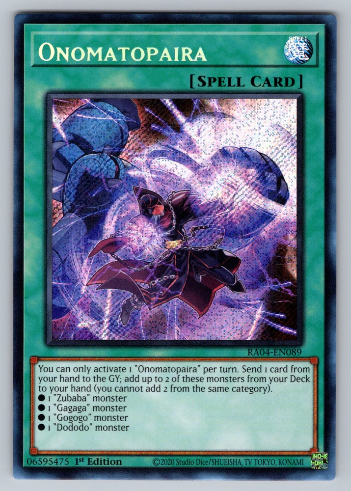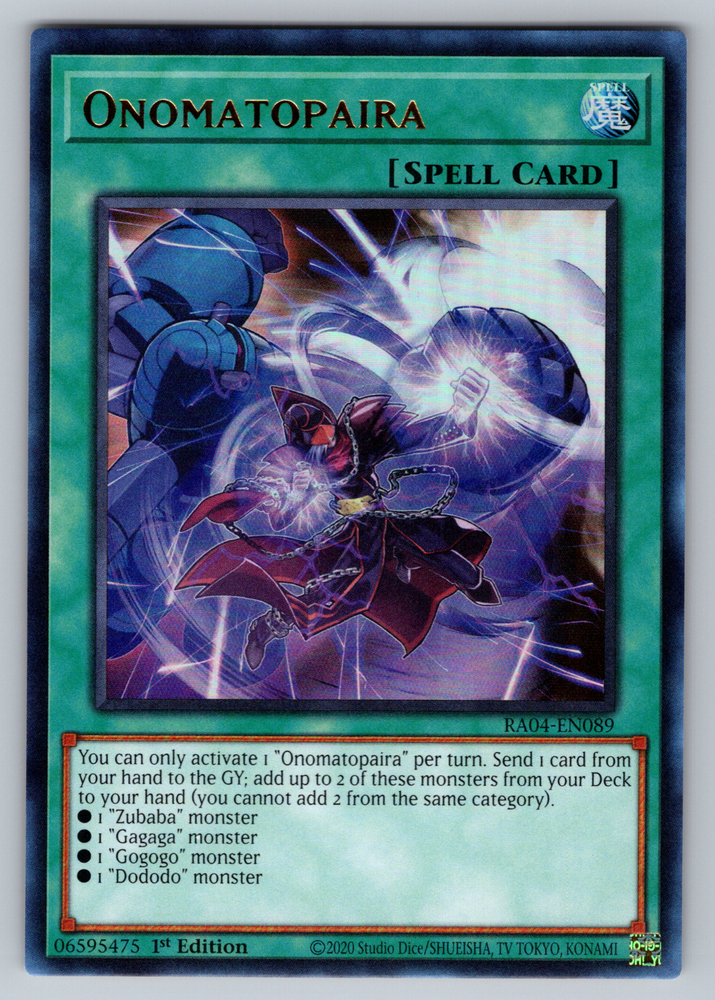 This listing is for Onomatopaira - RA04-EN089 from the Quarter Century Stampede set . Each photo in this listing is a stock photo as this is a bulk variation listing. You will receive the same card in the same condition selected , but it may not be the exact copy from the photo . Therefore, centering on the card you receive may differ from the centering of the card listed in the photo. Please be aware of this before purchasing. Each card will be in Near Mint condition. Cards in this listing may have some very minor imperfections (such as few small dots of whitening or a couple of very small scratches), but there will be no major damage to the cards (such as excessive whitening, scratches, edgewear, creases, water damage, etc). The cards from your order will be securely packaged in a card saver and card saver perfect fit sleeve and shipped with the eBay Standard Envelope program for cards under $20. Whether you're looking to power up your deck or add this to your collection, you'll be sure to enjoy this card! Check out our other listings for more Yu-Gi-Oh! cards!