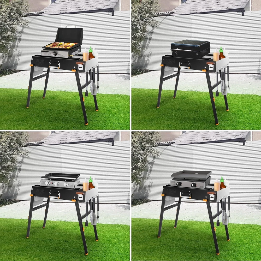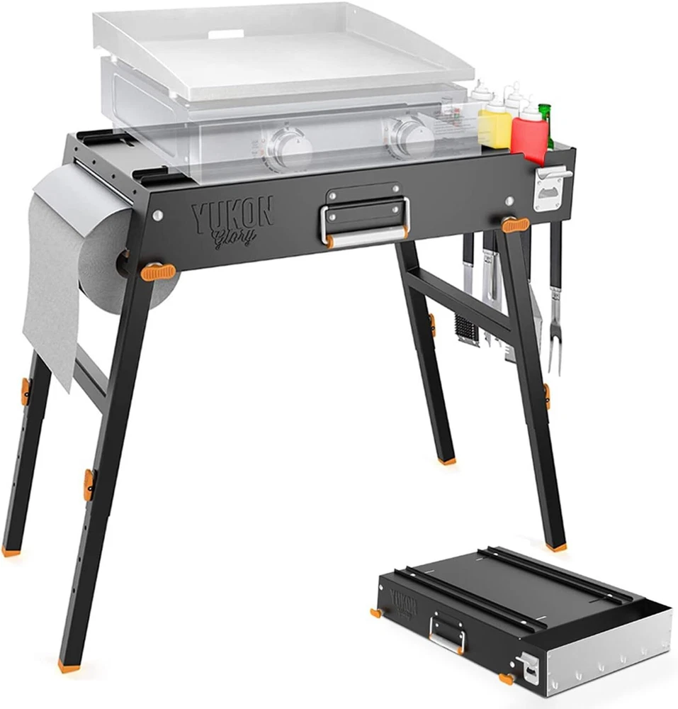 ULTIMATE GRILL STAND - Take your grilling table to the next level - this beauty has everything you need to griddle like a pro, including a cigar holder - bottle opener - paper towel holder - griddle caddy - hooks to hang all your grilling accessories - & a handle to transport with ease UNIVERSAL DESIGN - The Yukon Glory universal griddle stand was created with you in mind, the adjustable safety guides, allow you to use multiple different size grills and griddles - including the 17" propane griddle and the 22" blackstone griddle ADJUSTABLE LEGS - The table top griddle stand was conveniently designed with legs that adjust from 22" all the way up to 30" so you can easily choose the height that works best for your outdoor grill table PORTABLE GRILL TABLE - Easily fold up the griddle table, grab the handle and go, whether you're traveling and camping or simply moving it from your patio or yard - transport your grilling stand with ease PREMIUM QUALITY - The Yukon Glory grill stand is made from high quality material including strong and durable stainless steel - enjoy your upgraded griddle space, without having to worry about rust or corrosion for years to come On Oct 11, 2024 at 06:55:42 PDT, seller added the following information: On Nov 21, 2024 at 23:20:56 PST, seller added the following information: